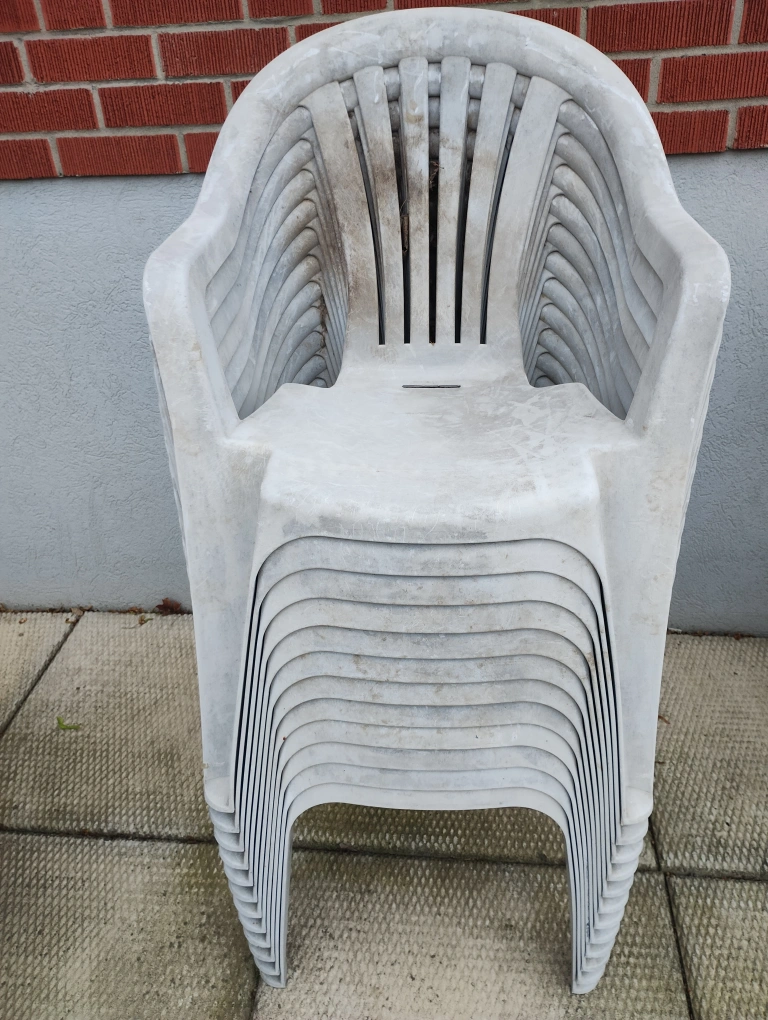 A stack of 12 chairs with armrests. Constructed from light-coloured plastic. They are used, ideal for outdoor seating. These chairs would be perfect for setting up a relaxing area in your backyard. May need some TLC/cleaning after winter storage.
