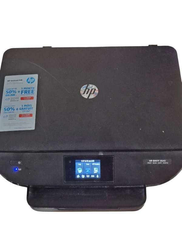 This printer is great for printing your favourite photos. It is black and has a small LCD screen and buttons on the front. It features copy, scan and photo functions. It is perfect for any office or home setting.