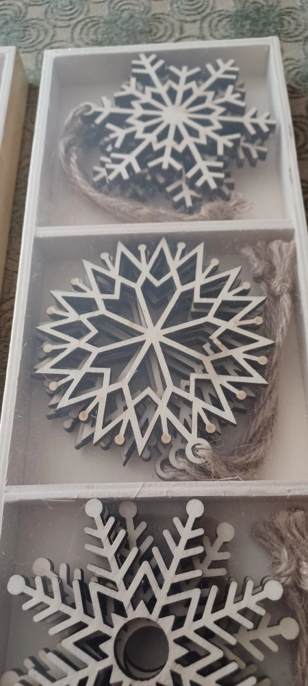 Beautiful snowflake ornaments. Each set includes 9 ornaments. They sit in a divided white box. A perfect touch to your winter décor, you will love them.