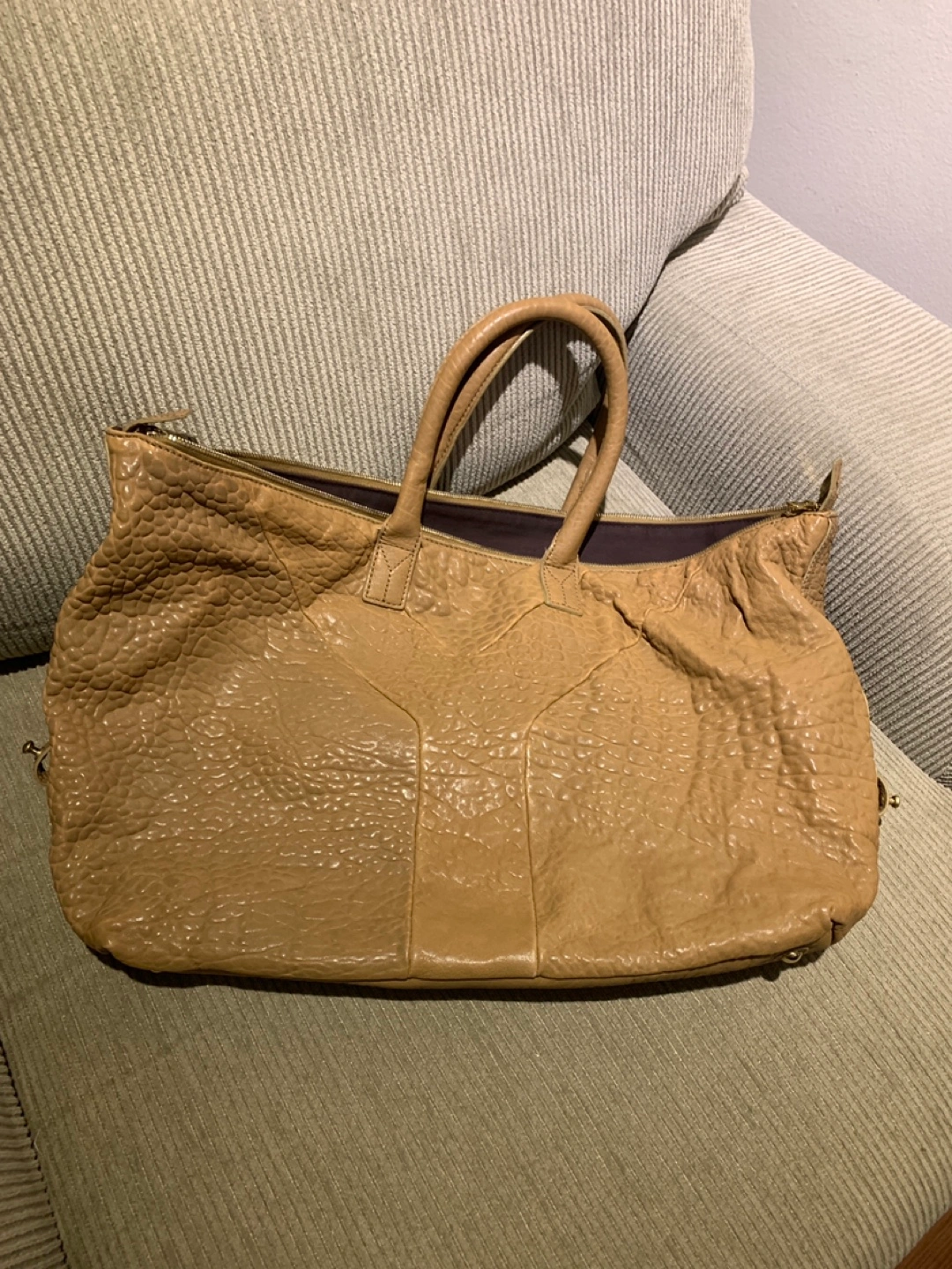 authentic Yves Saint Laurent YSL beige tan pebbled leather handbag with zip closure.