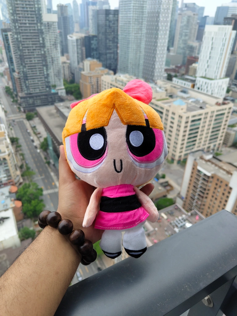 A super soft and adorable Blossom plush. Her signature pink dress is easily recognizable. She has a big pink bow. Perfect for a child's room or a fan's collection, the comforting presence of this plush can bring a smile to your face.
