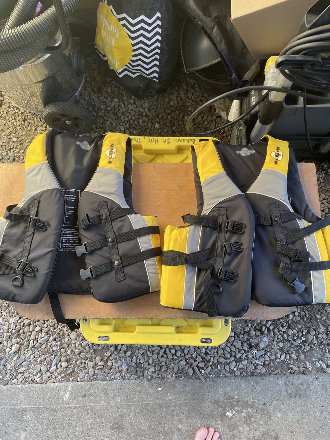 Fluid black and yellow life jackets. Properly cared for and stored. In great condition and smell good too. Adult small or X-Large child fit. Great for a safe and relaxing day on the water. $20 each or $30 for the pair.