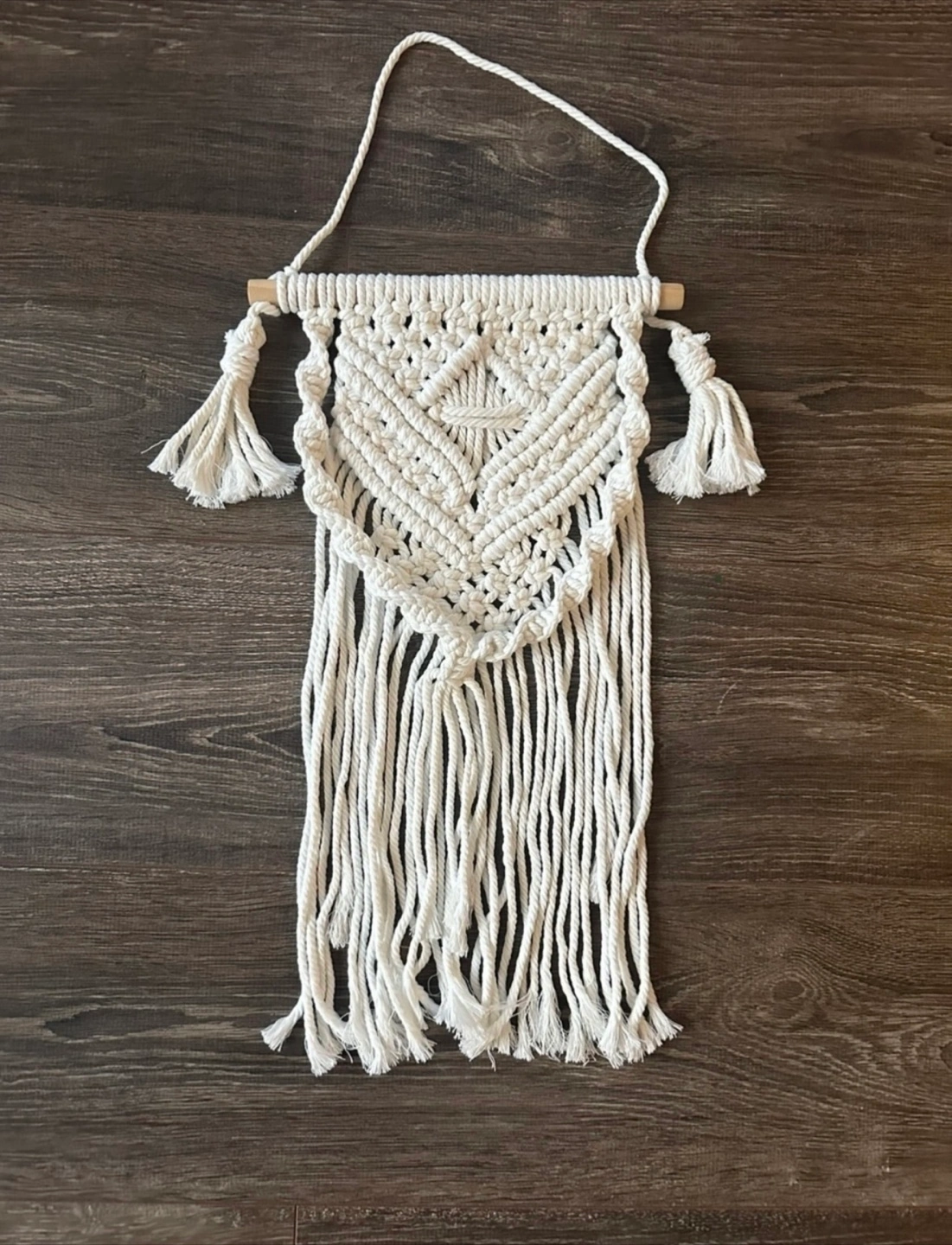 Beautiful, white macrame wall hanging. Features a geometric design and fringe detailing. Adds a touch of bohemian flair to any space, a calming effect is easily achieved when gazing at this wall hanging.