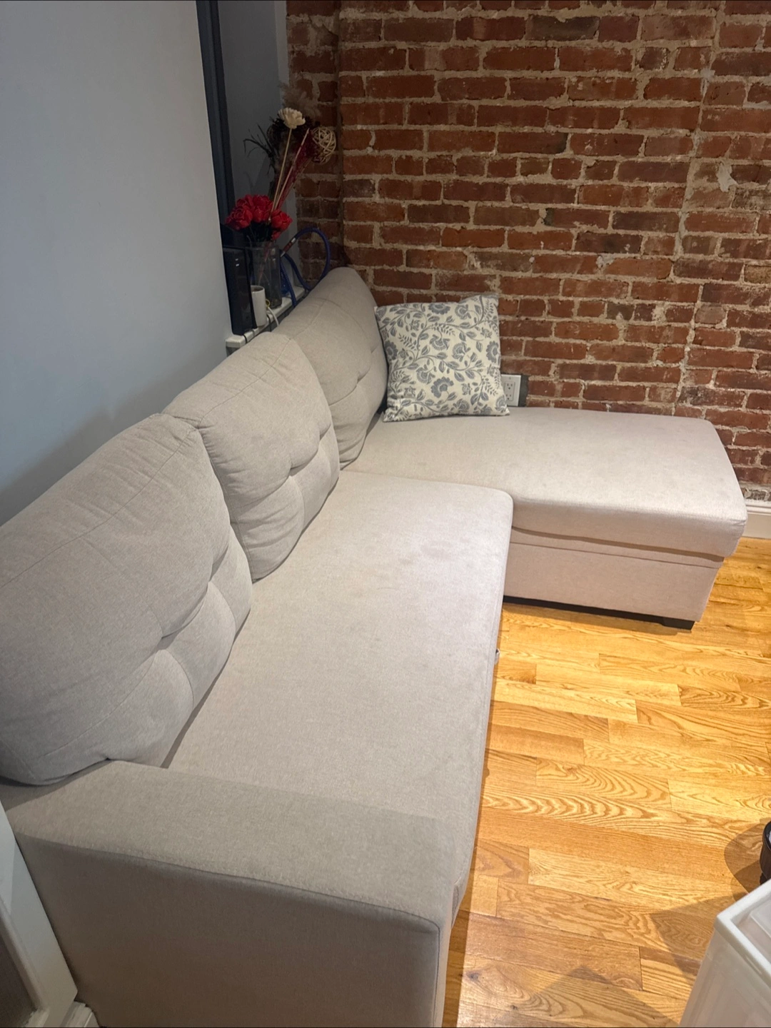 A comfortable and stylish sofa. Features a pull-out bed and a chaise lounge. Provides a space to relax at the end of the day. Pick up only on weekends. Good condition. I am on the first floor of a walk up. So please be aware that you would have to take the couch down one flight of stairs as there are no elevators. There is lots of street parking