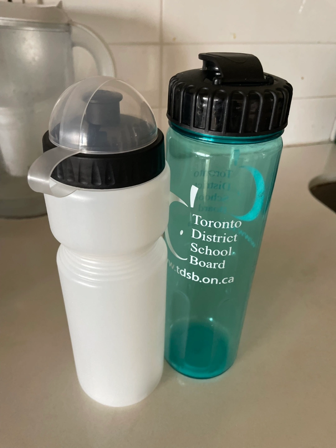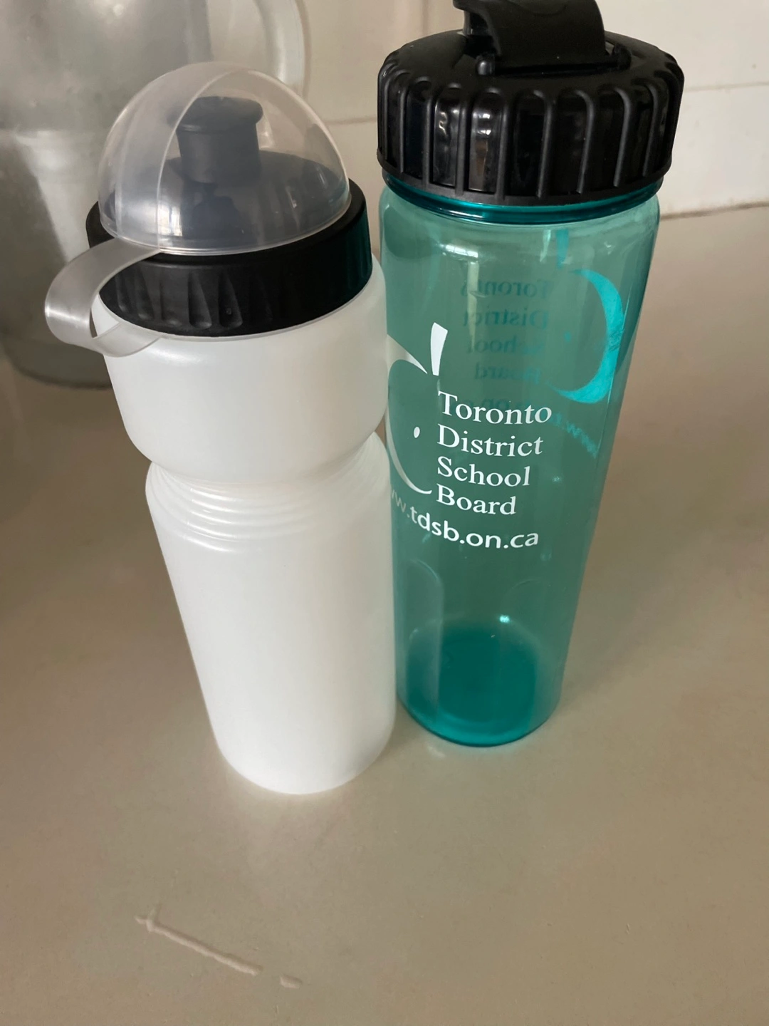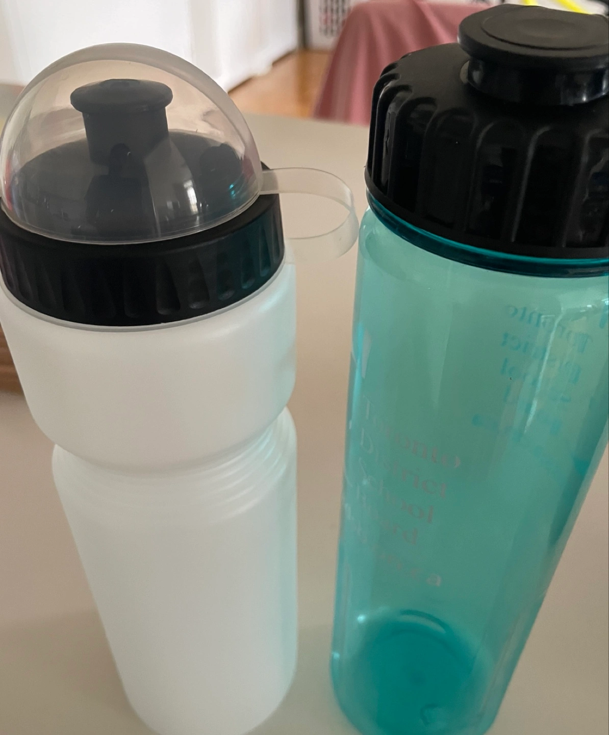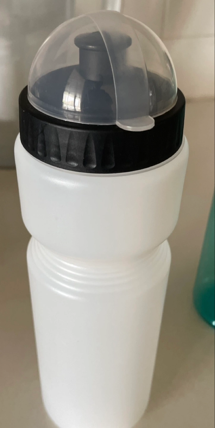 I am selling a white water bottle. It features a black lid with a clear cap. The bottle has a curved body. Staying hydrated can be very relaxing.
