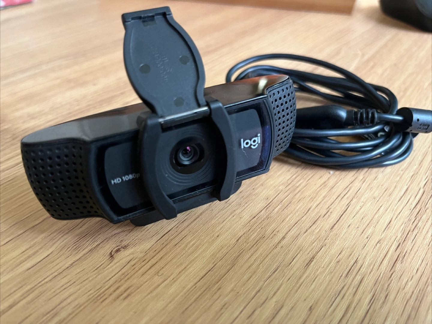 Logitech webcam with built in microphone. Wired, USB. HD 1080. Built in flip down camera cover. Adjustable mount for various computer/laptop/tv.