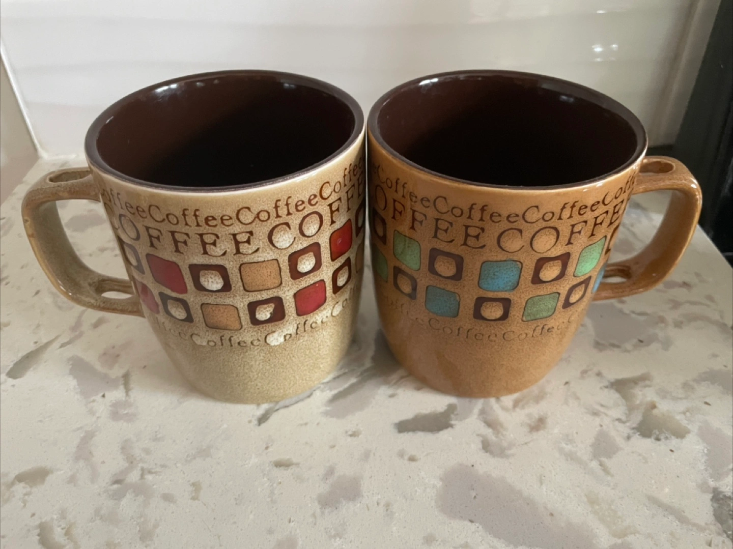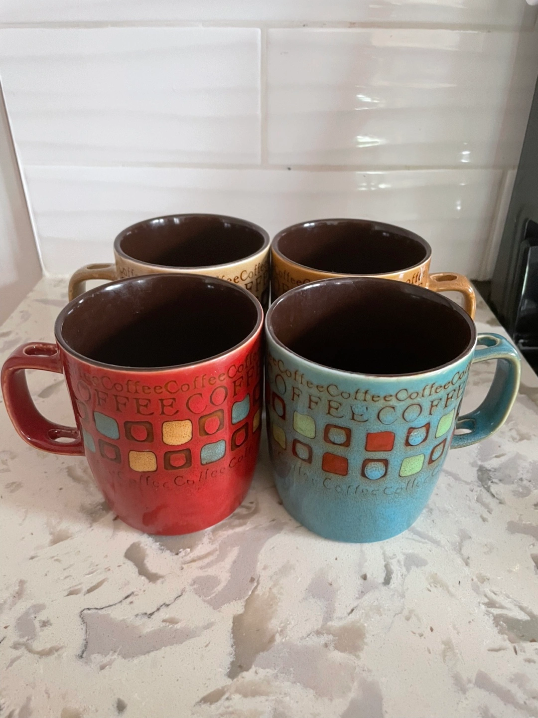 Coffee mugs with assorted colors and designs. Each mug appears to have a brown interior. Great to use for your morning coffee.