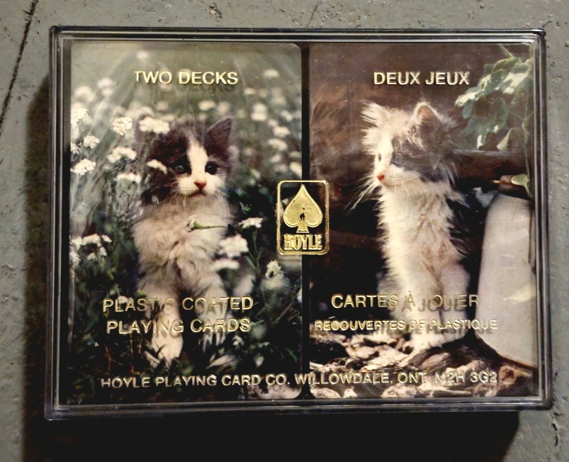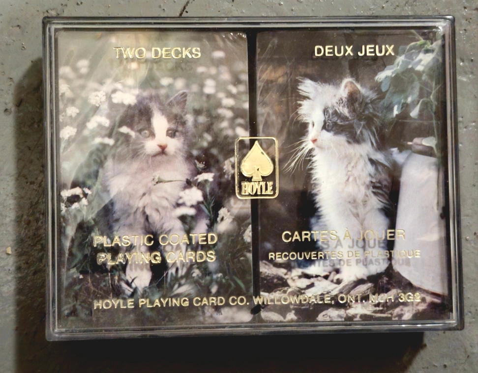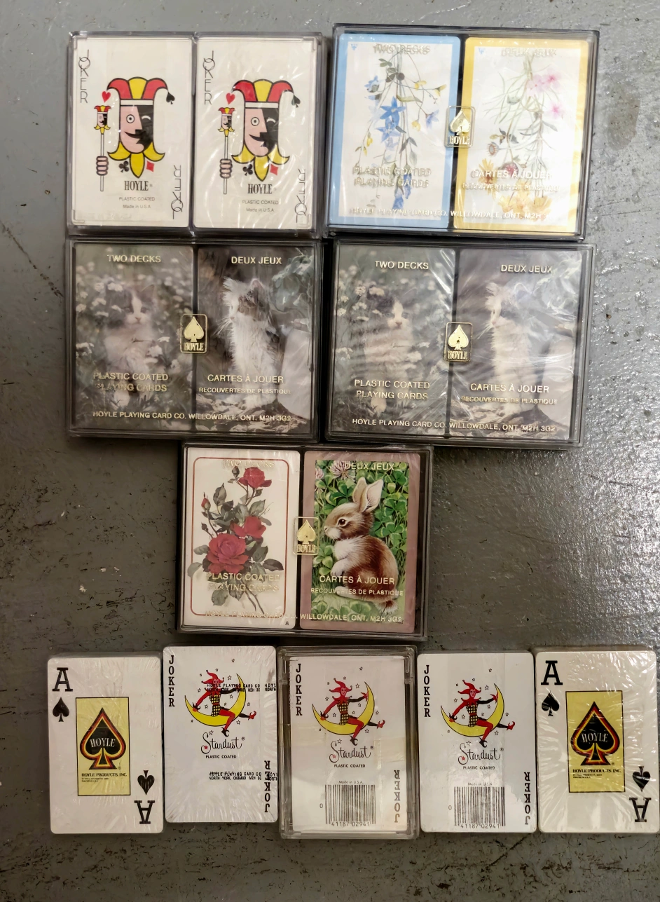 Discover a nostalgic collection of vintage Hoyle playing cards, each deck a piece of history! These charming cards feature delightful designs, perfect for collectors and card game enthusiasts alike. The collection includes a variety of themes, from floral patterns to playful kittens, all encased in their original plastic packaging.