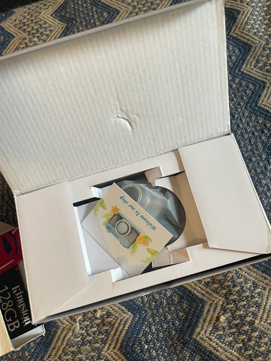 A Vehicle BlackBox DVR, in its original packaging, that can be used to record while driving, providing peace of mind during your commute. It appears to be new and in its box. It features multiple specifications like a built-in microphone and motion detection. Comes with a micro SD card for storage. The box is a bit damaged but otherwise the product itself has never been used.