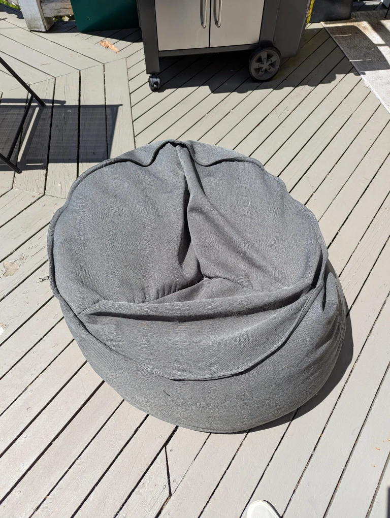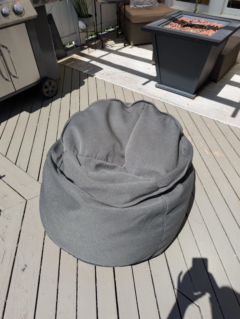 Round, grey beanbag chair. Features a sturdy material. Perfect for relaxing and enjoying a good book. Cleaned but not from a pet free home.