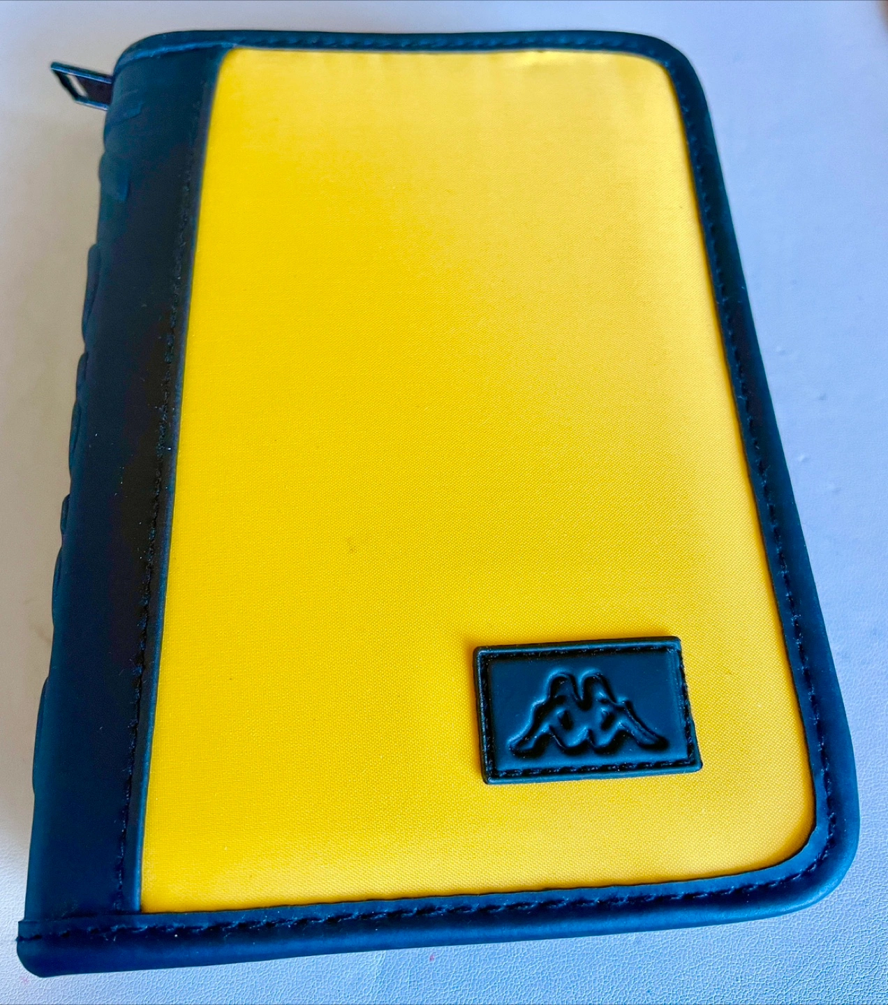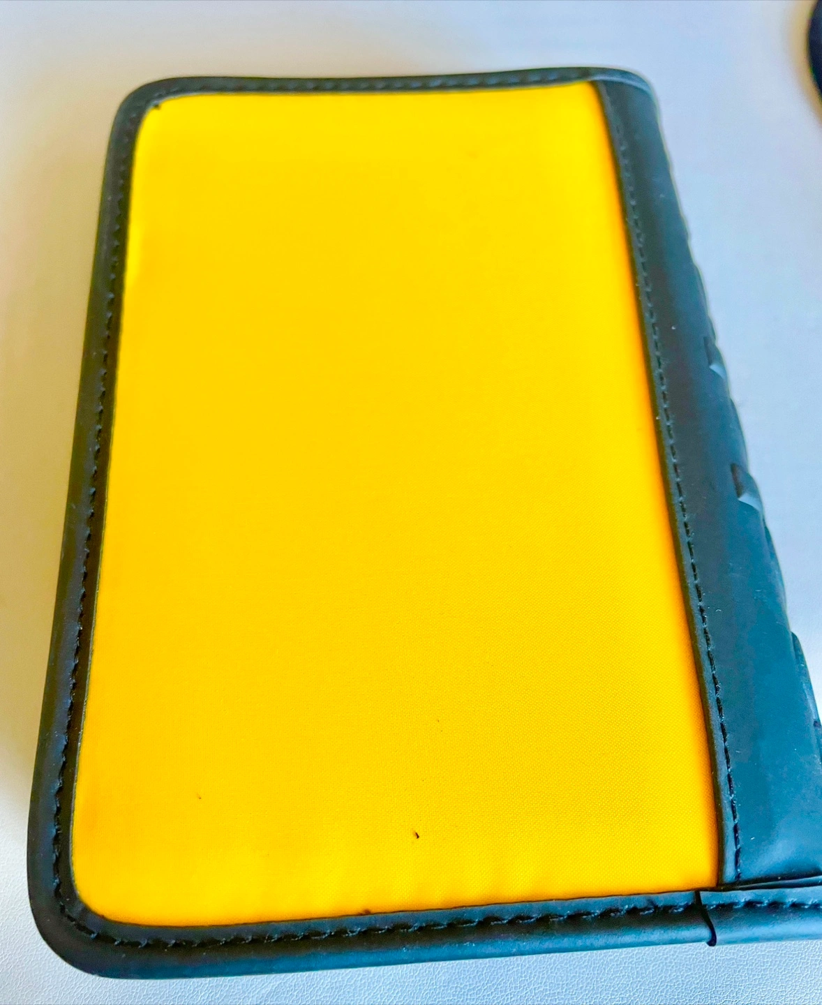 A sleek, black and yellow organizer. Interior with many slots and compartments. Features a notebook. A great way to organize your thoughts and schedule effectively.