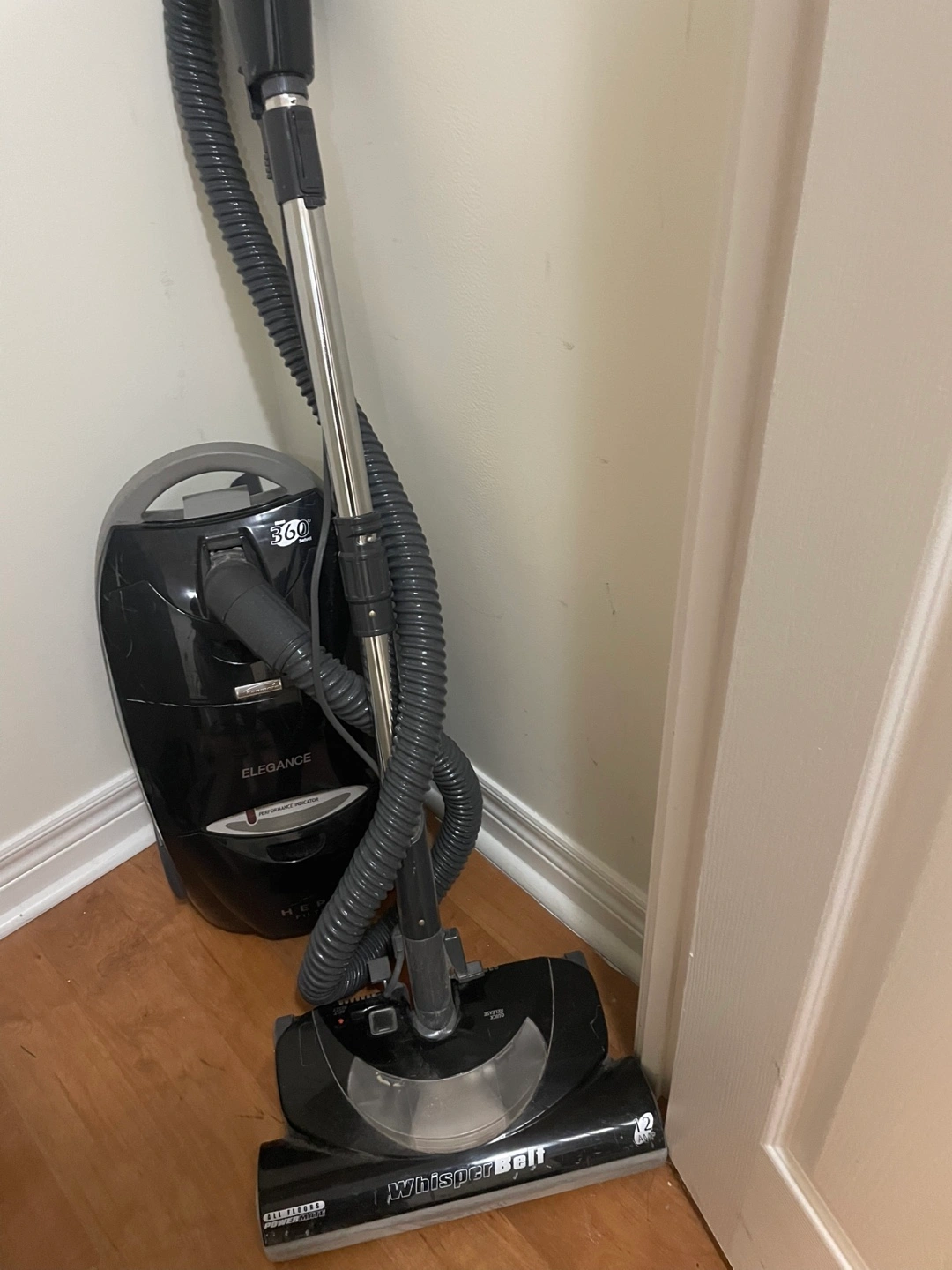 A Kenmore vacuum with Hepa Filter, PetPowerMate attachment as well another accessory. The vacuum features a bagged canister design, along with a hose and wand. Can be used for carpet as well as uncarpeted floors. Bags not included. Pick up at city center.