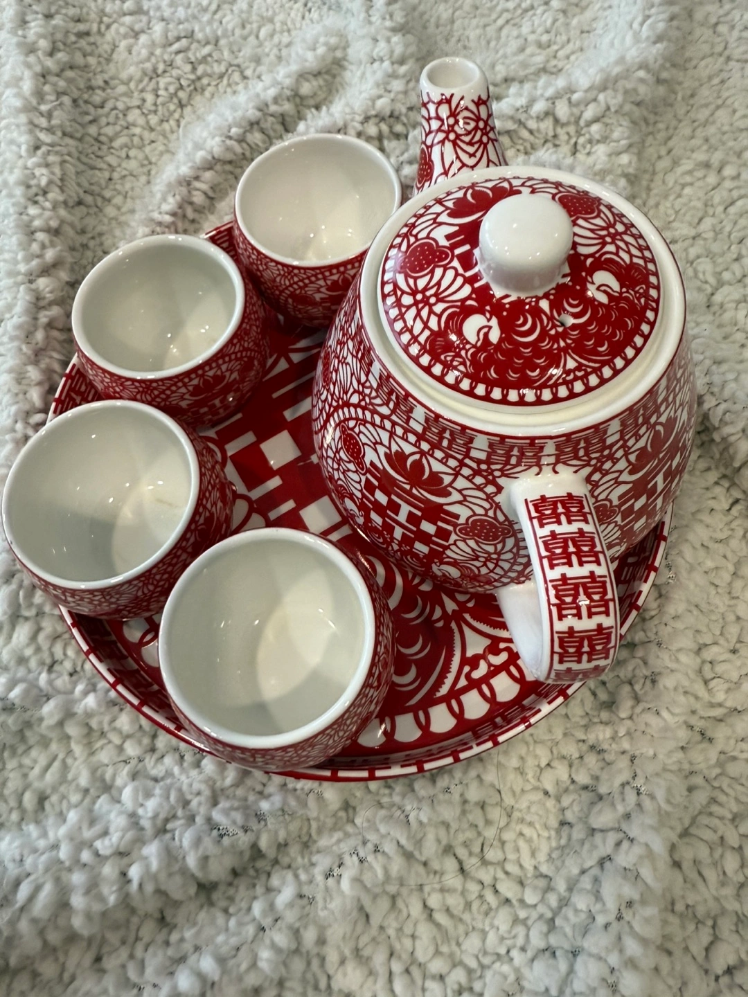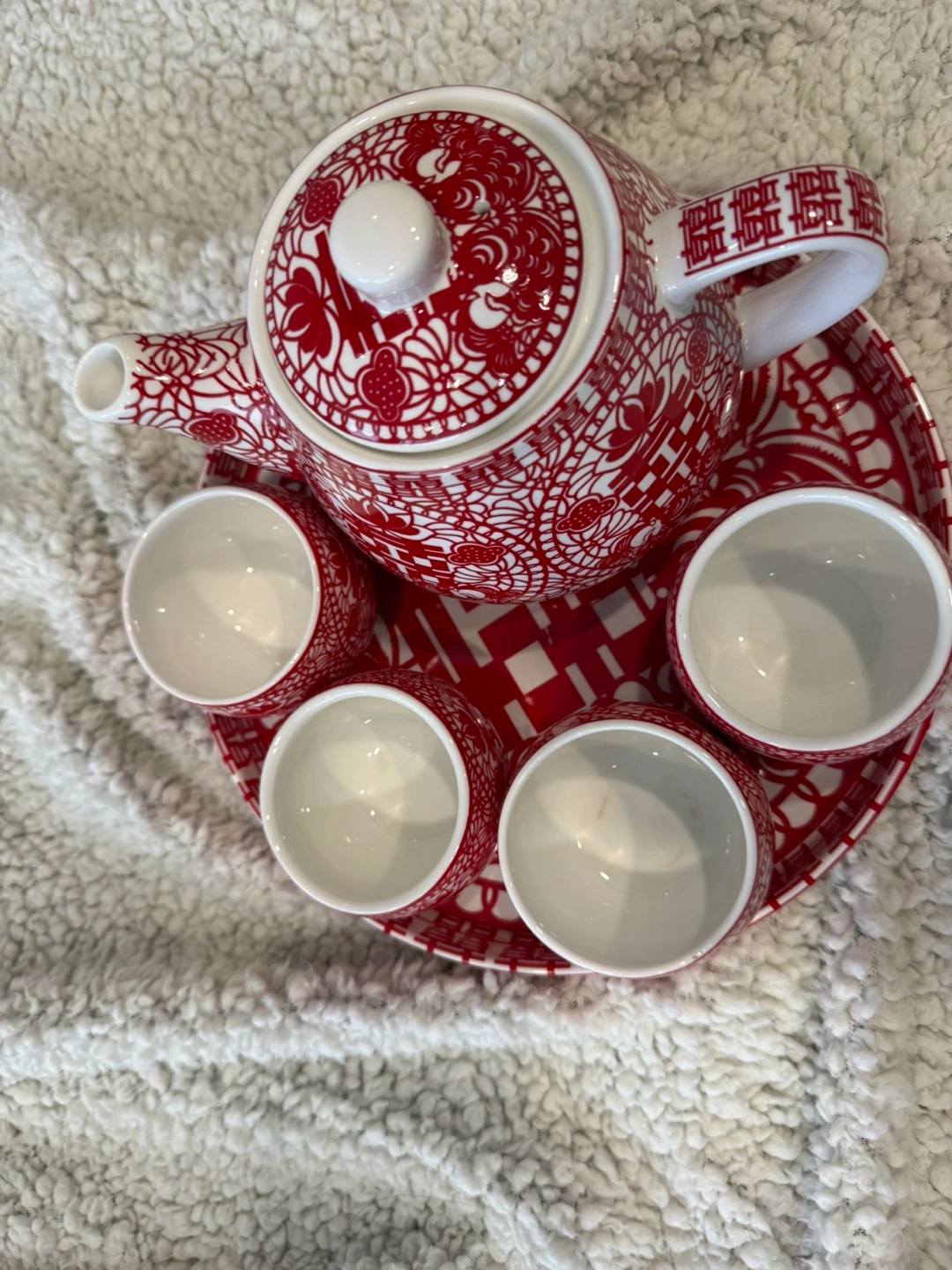 Beautiful tea set, featuring a teapot, 4 cups, and a serving plate. Intricate patterning weaving in double happiness Chinese characters. Cash and pick up.