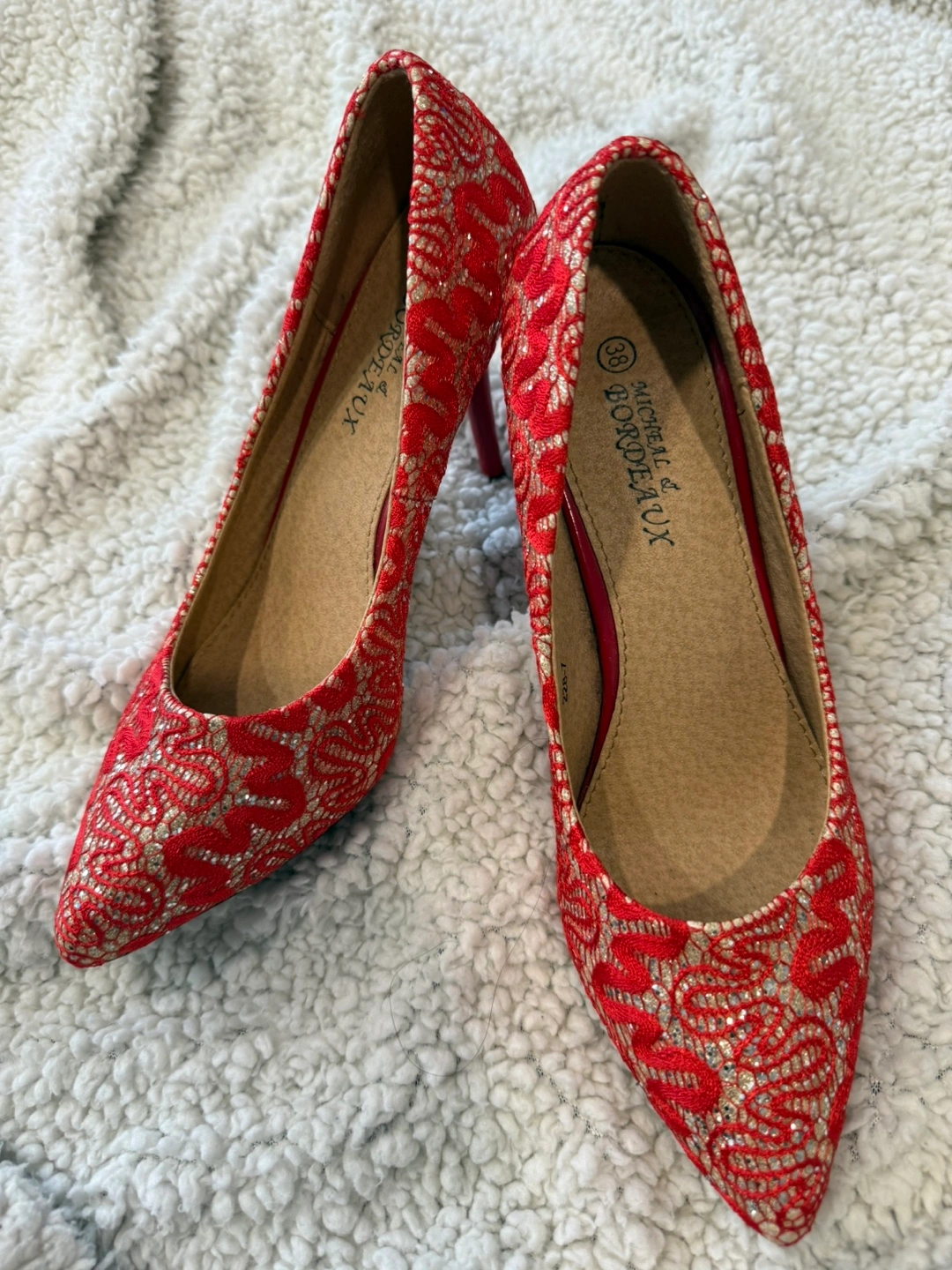These heels have a striking red and gold pattern. They also feature a pointy toe and a stiletto heel. Perfect for tea ceremony. Cash and pick up.
