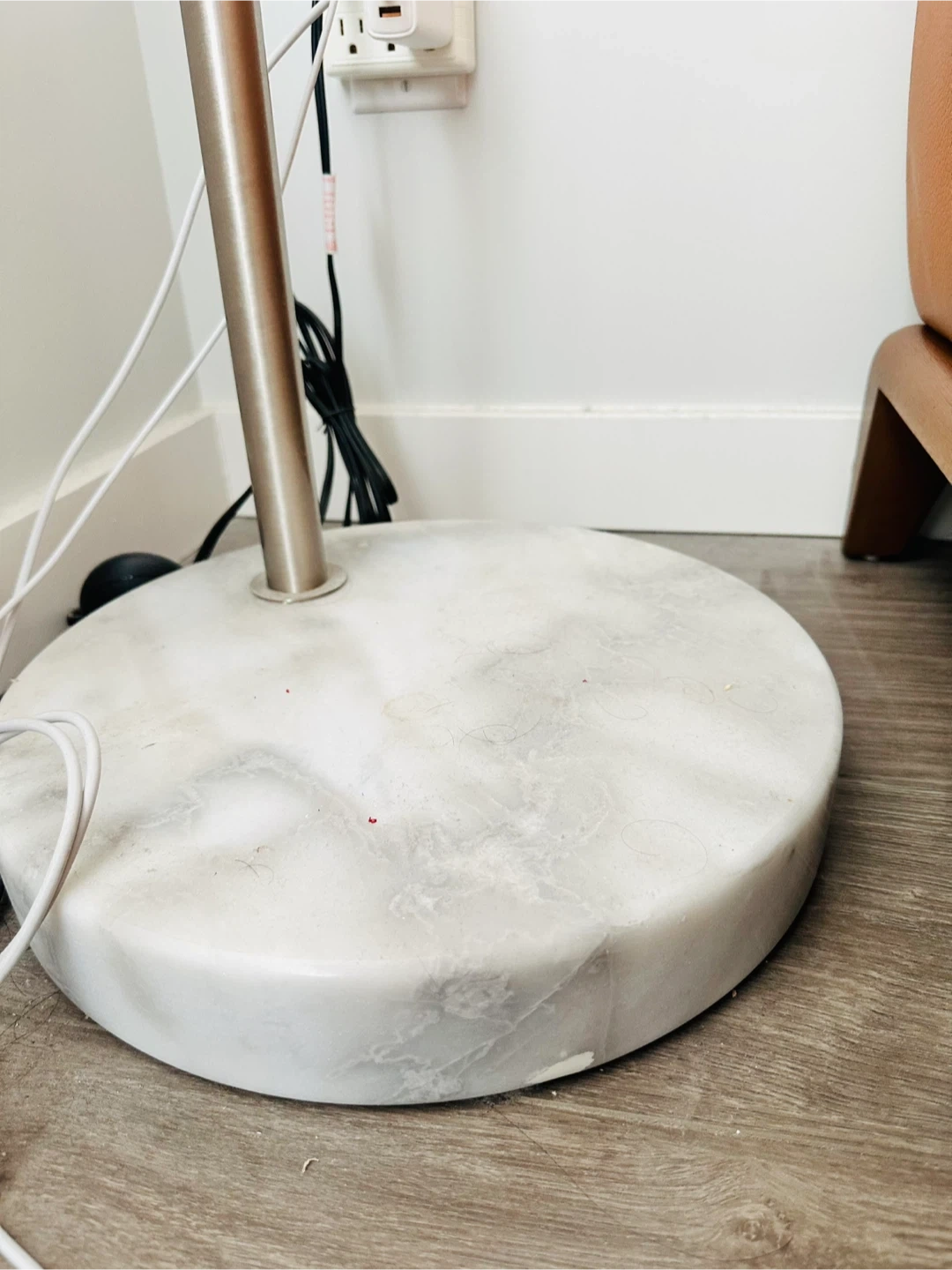36Curved metal frame. White lampshade. Marble base. A lovely lamp to read under in the evening. Real marble pedestal and lamp is height adjustable. Pick up in Richmond