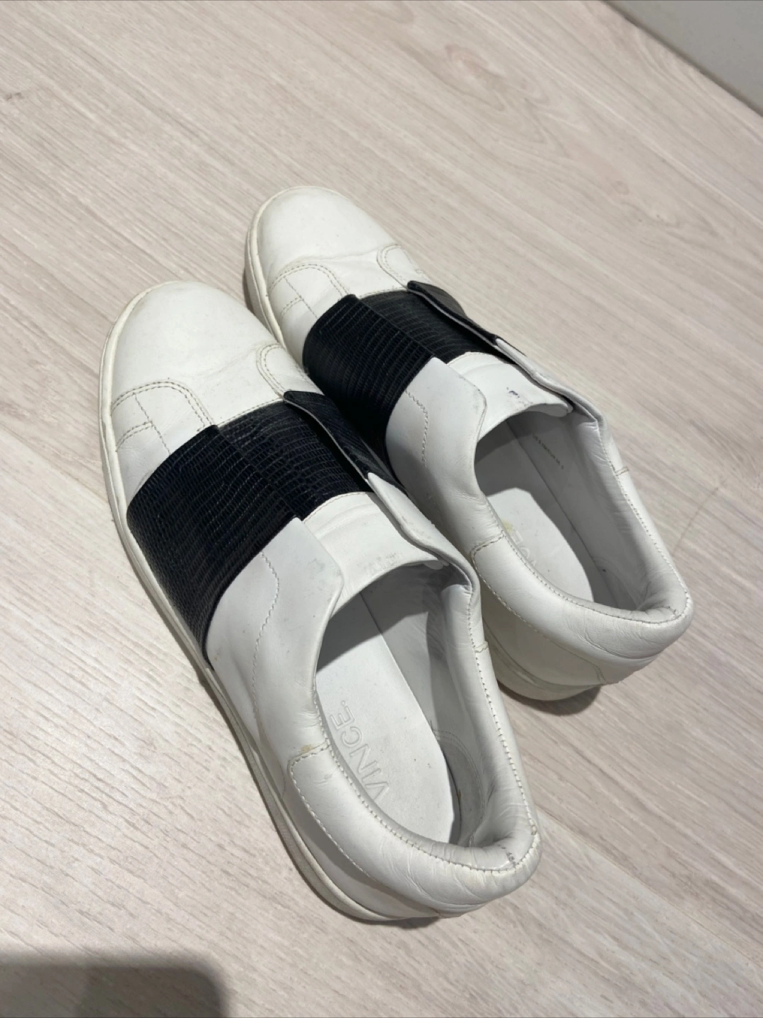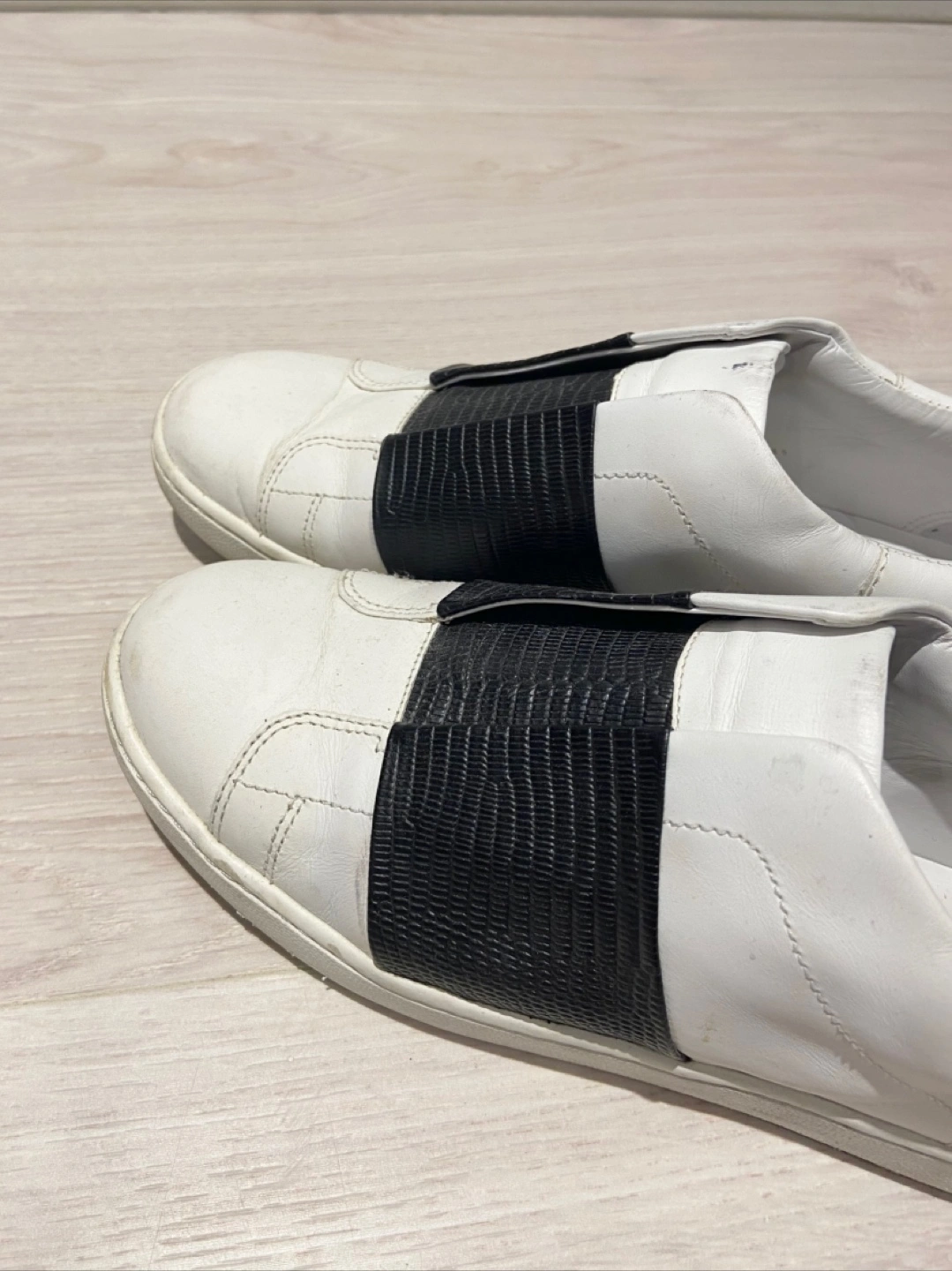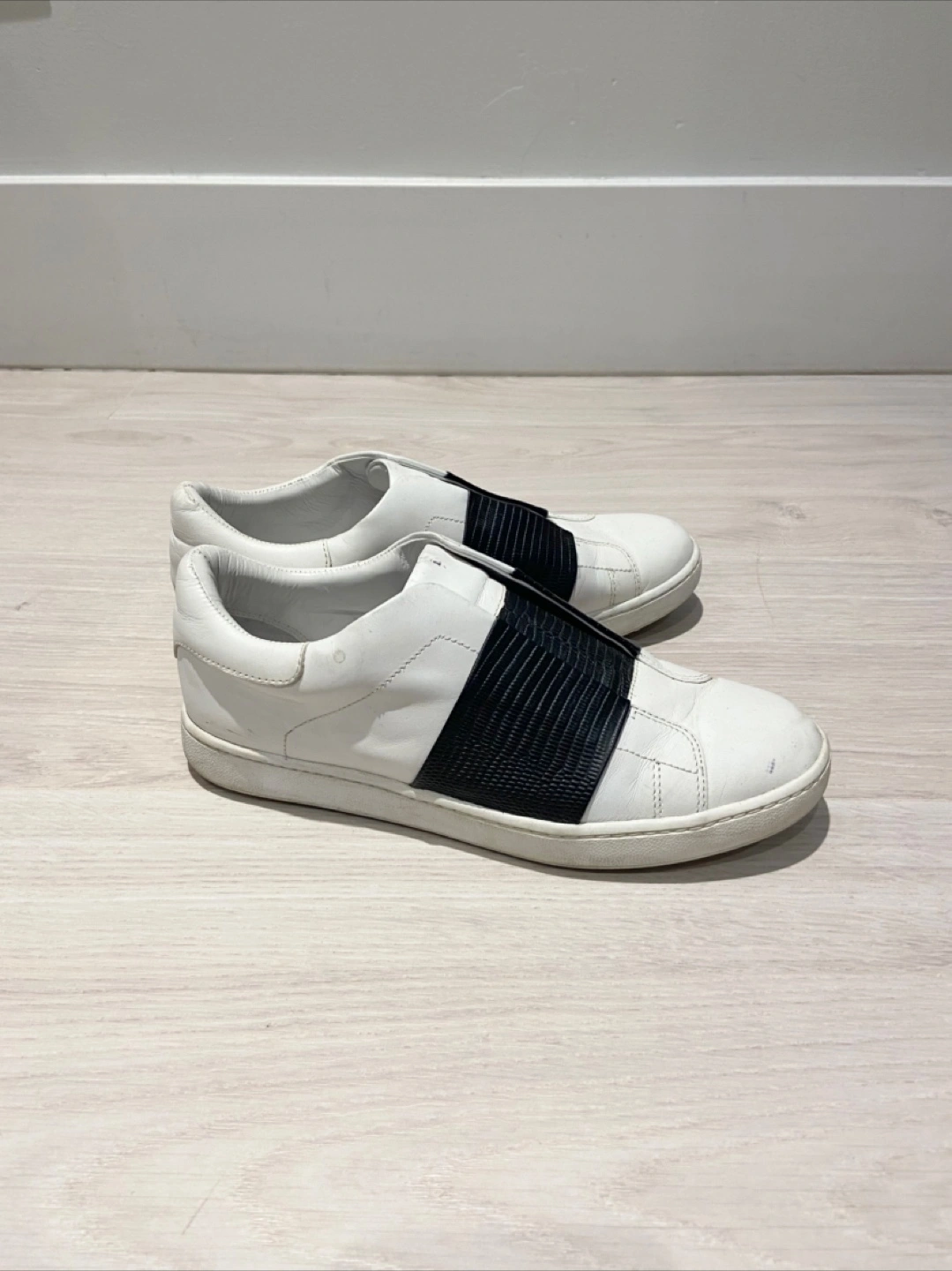 Womens’s White leather sneakers. Features a black band across the top. Slip on style. Slightly worn with some marks.