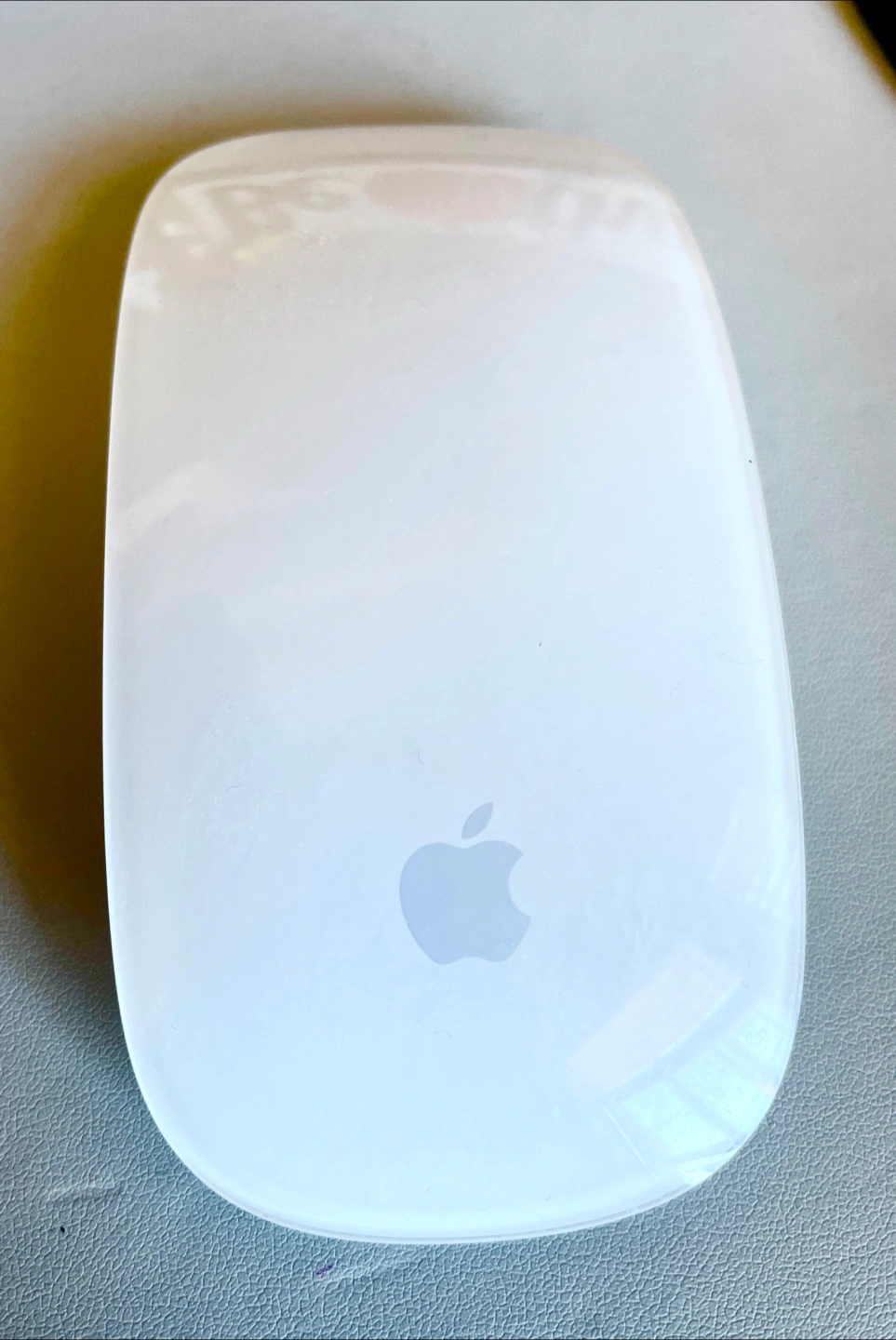 A wireless mouse in white. Features the Apple logo. Great for navigating your computer with ease. You can use it for many hours of stress-free computing.