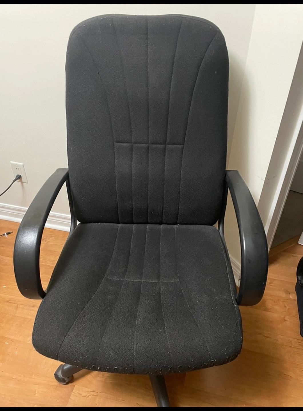 Office Chair with a tall back, armrests, and a five-star base with wheels. Upholstered in black fabric. Pet-free, smoke-free home.