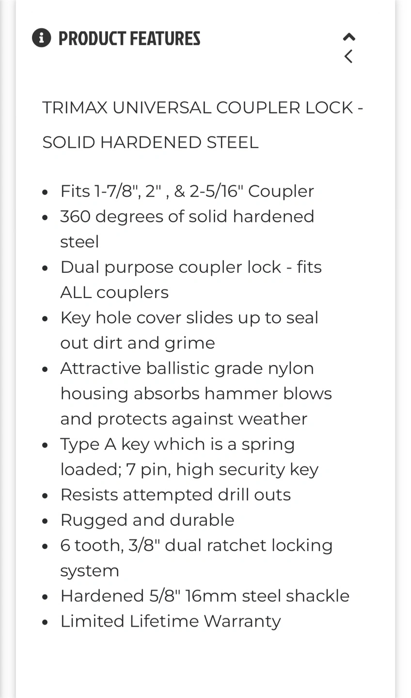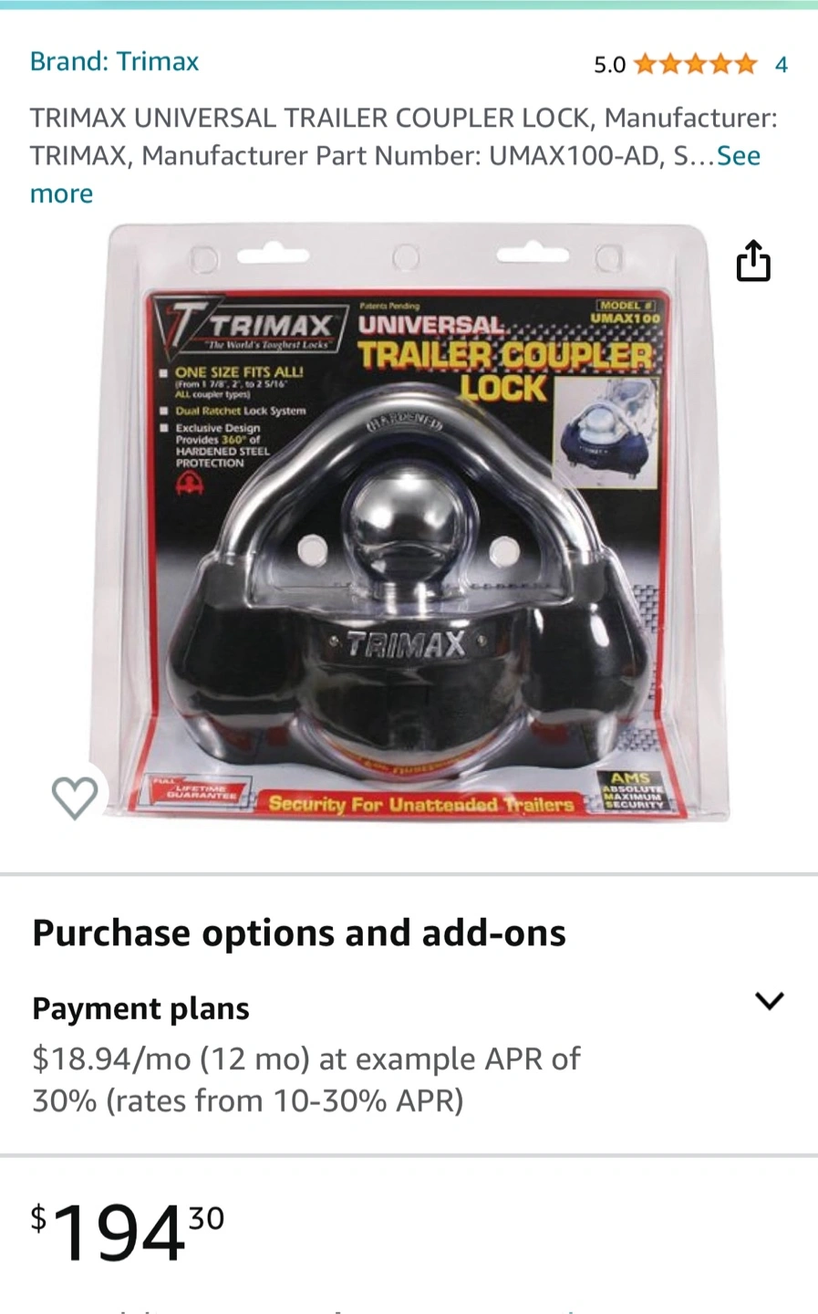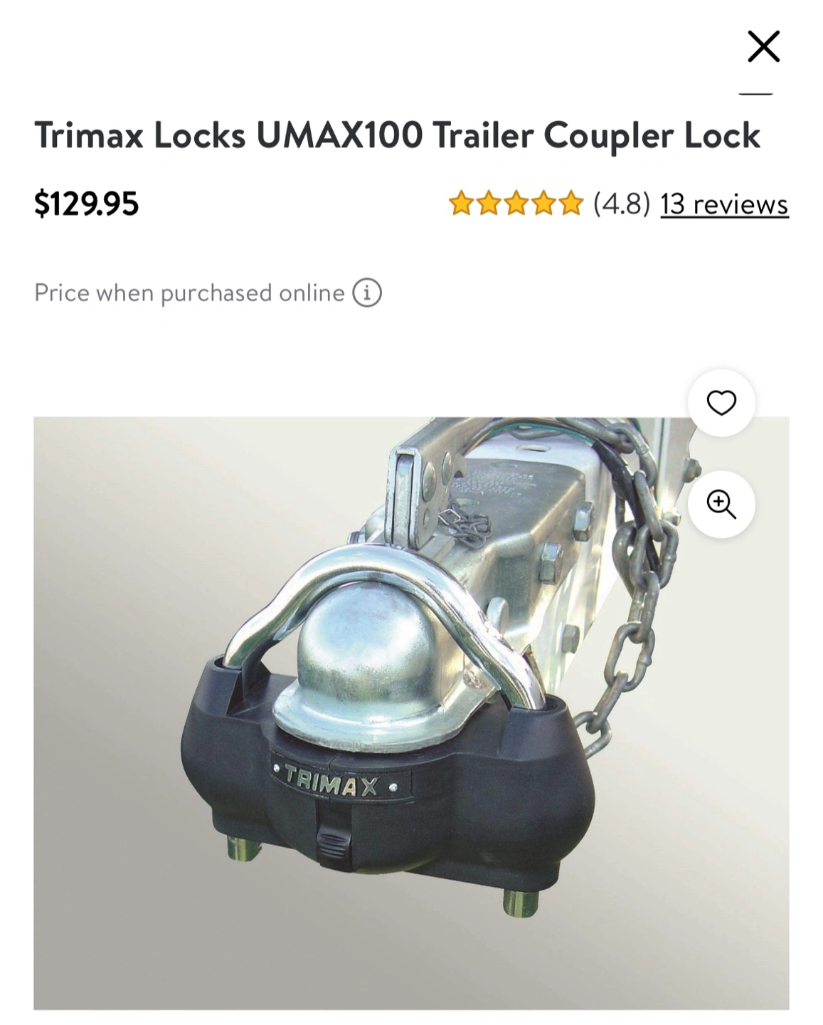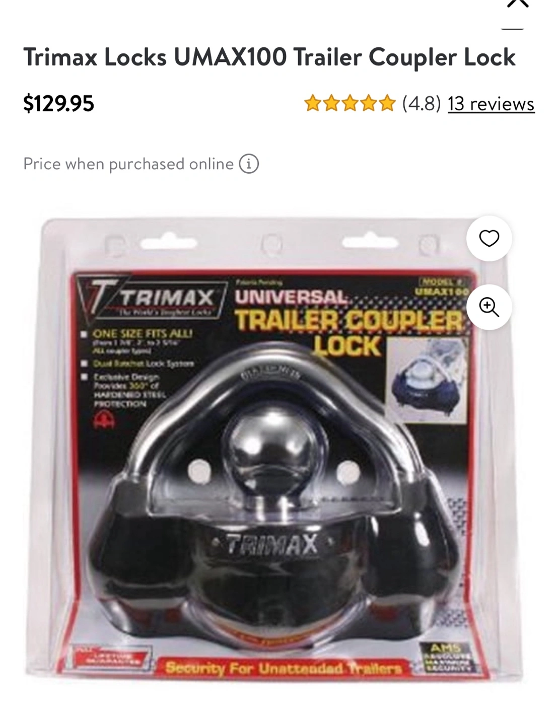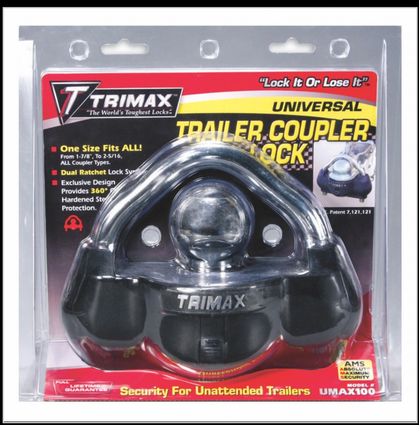 Trimax Universe Trailer Lock model Umax100D for all size ball and hitch brand new used once in original packaging, comes with two keys as well and a lifetime replacement cost without receipt if anything goes wrong, see guarantee on packaging. Cost $195 + tax I'm asking lot less. I also have the same Trimax Trailer lock model Umax50D only difference the 50D doesn't have the protective cover hence a little more cheaper.