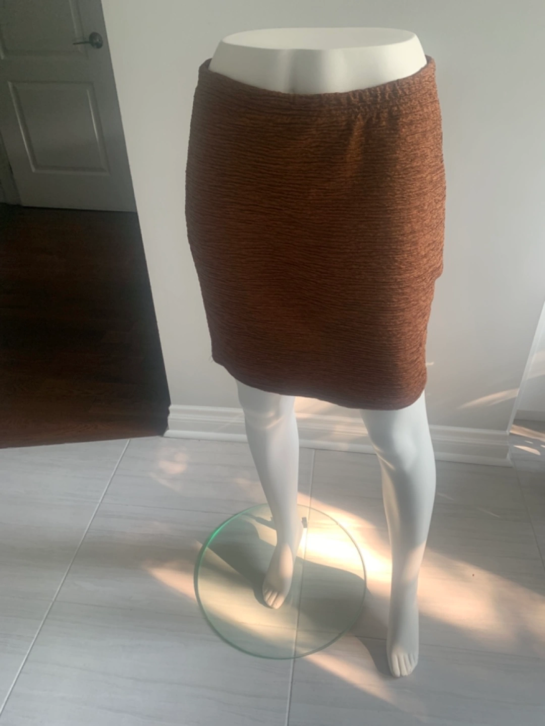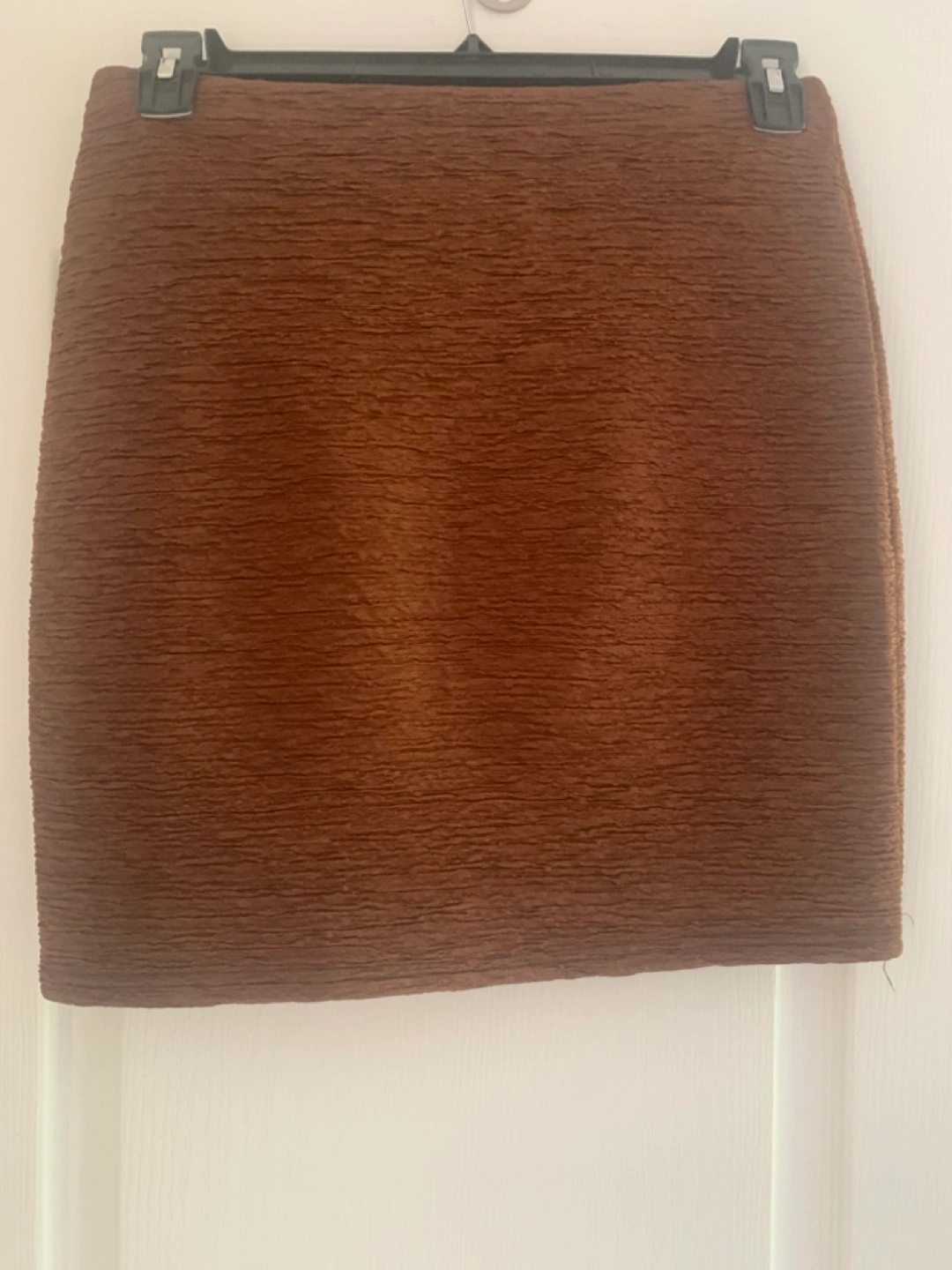 A textured mini skirt in a brown hue with a stretchy waistband
