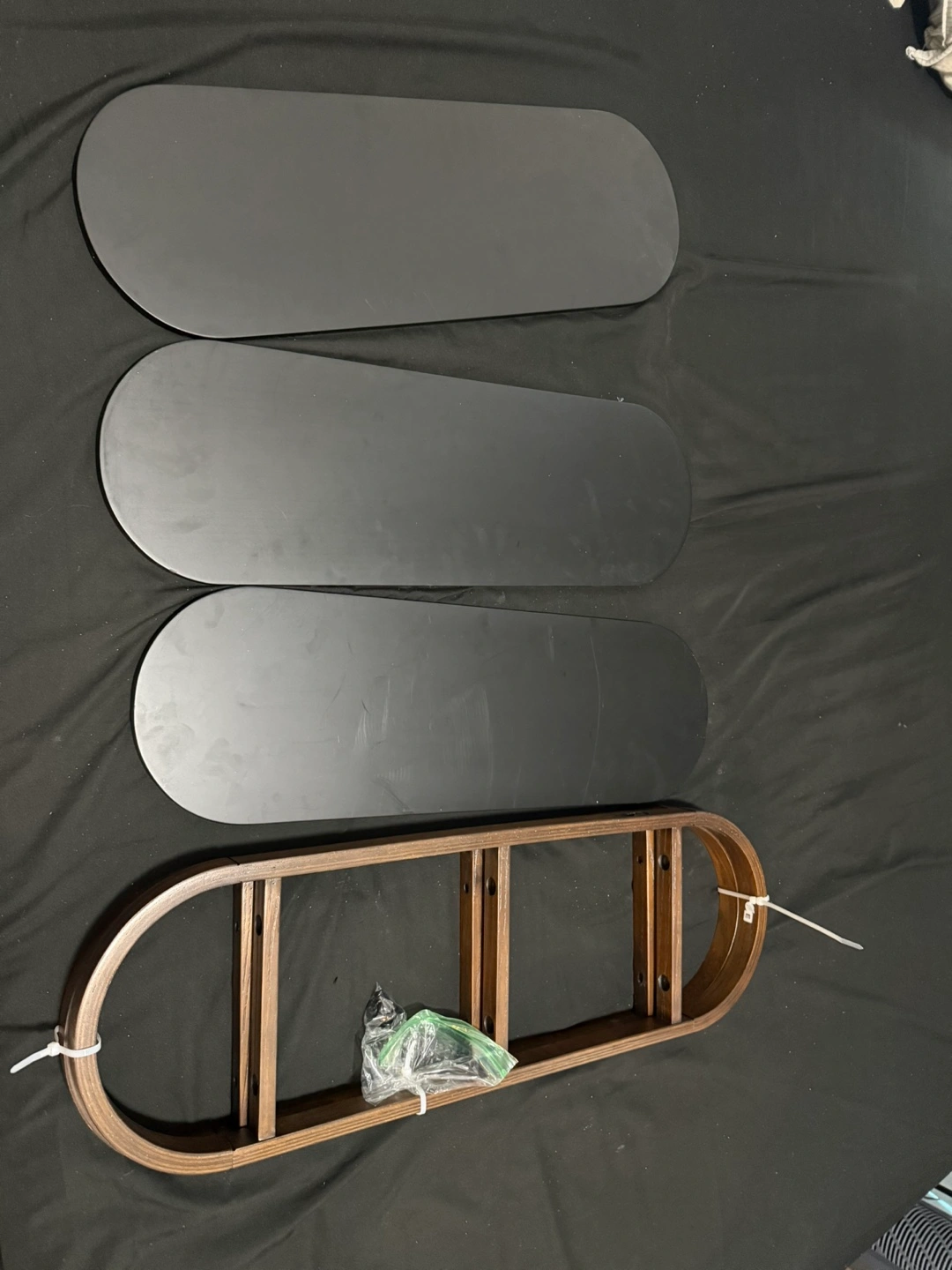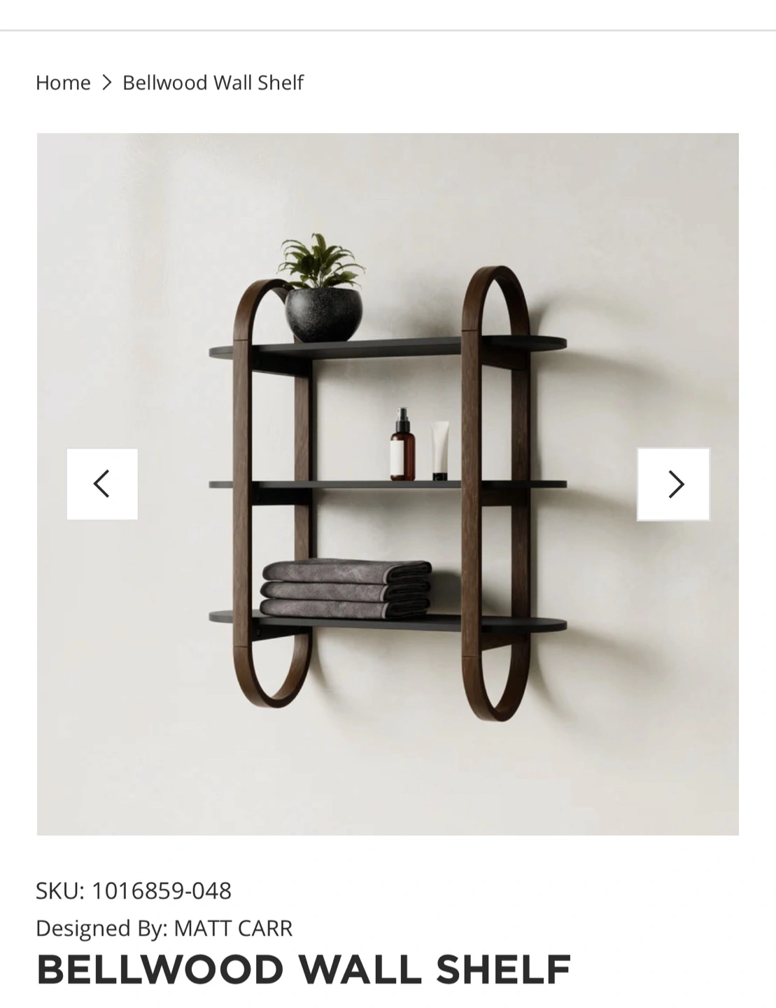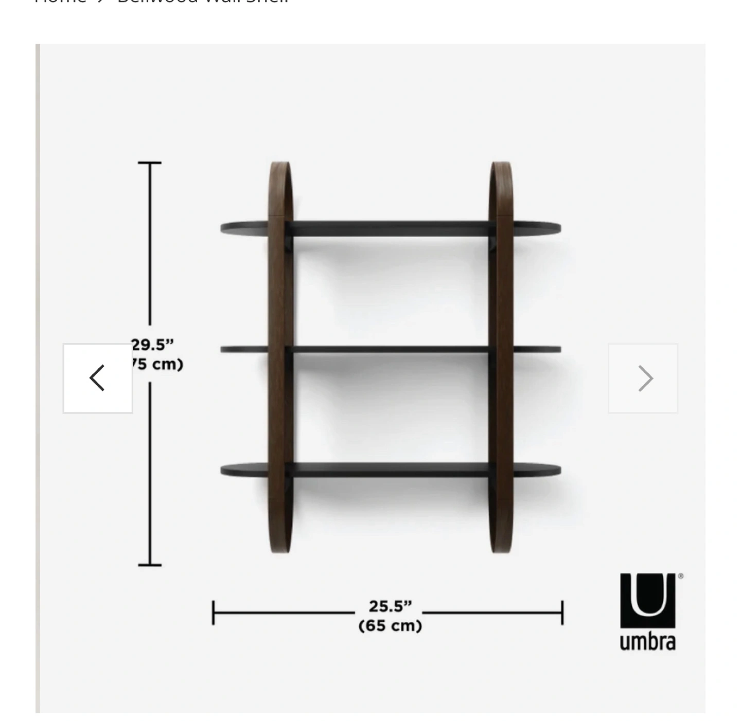 A stylish three-tier wall shelf. Featuring a dark wood frame. The shelves are a dark, matte colour. A perfect shelf for any bathroom space or living area to showcase decorative pieces.