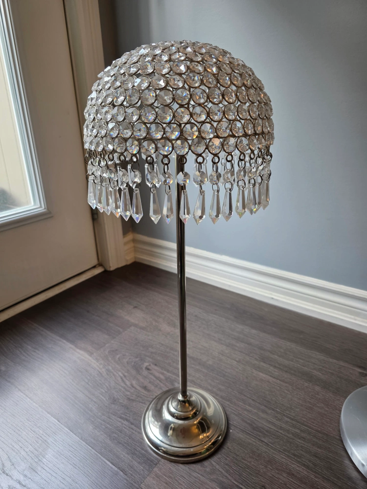 Pretty crystal lamp with a metal stand. The lamp's shade is composed of crystals and it takes 3 AA batteries to light up.
