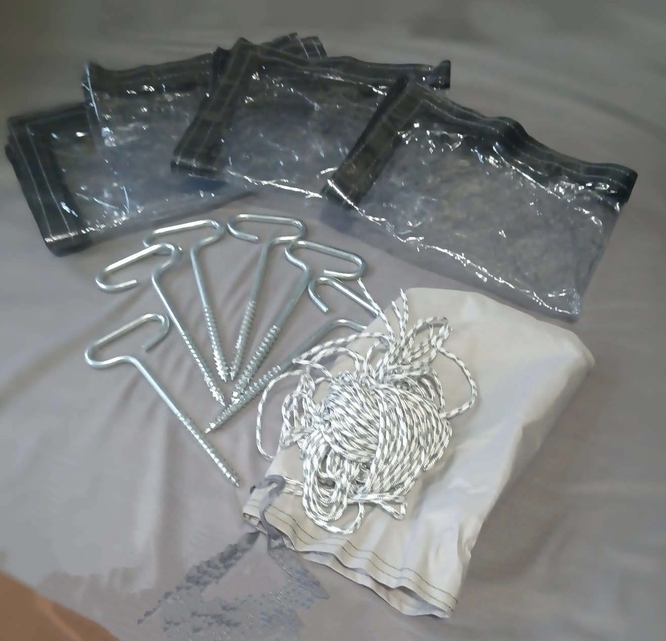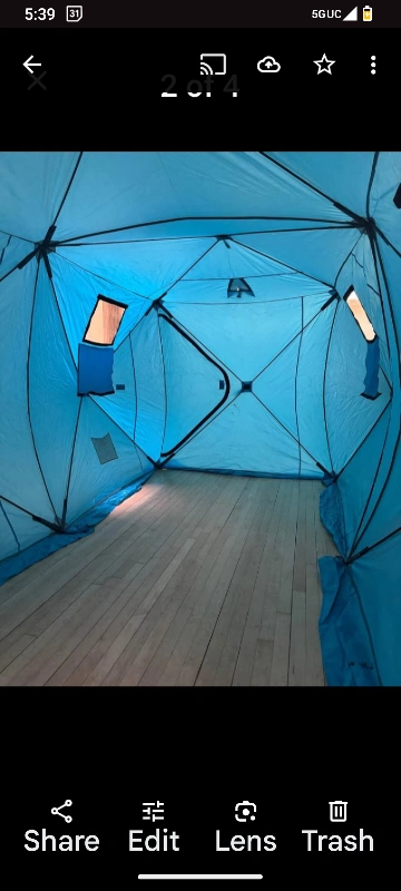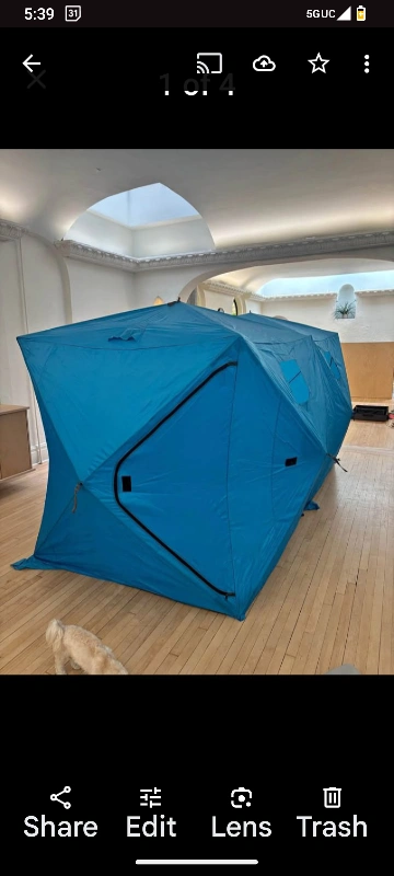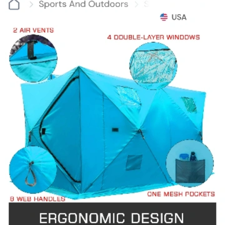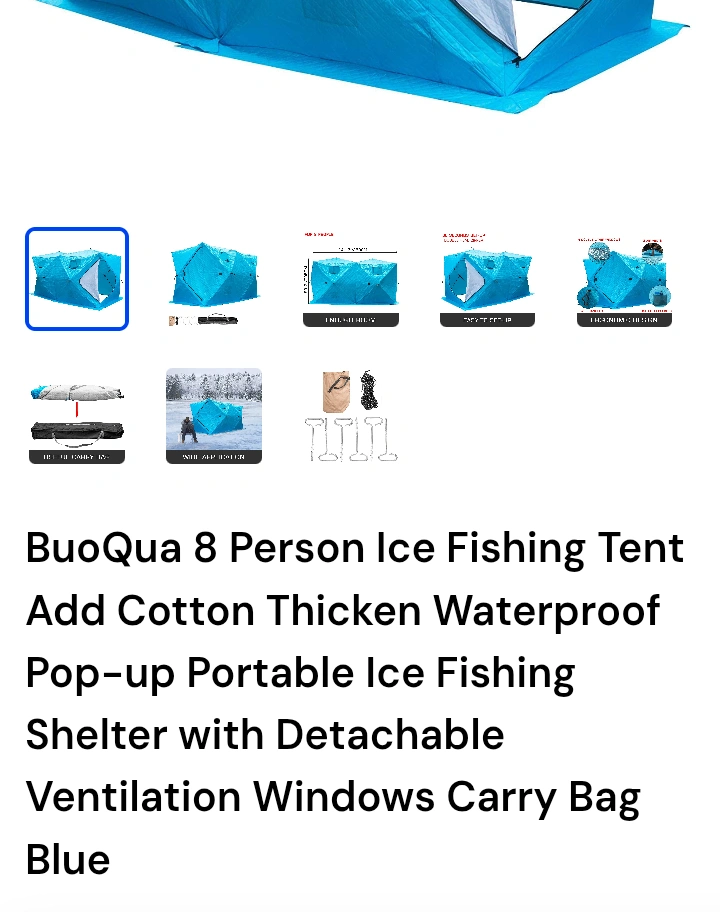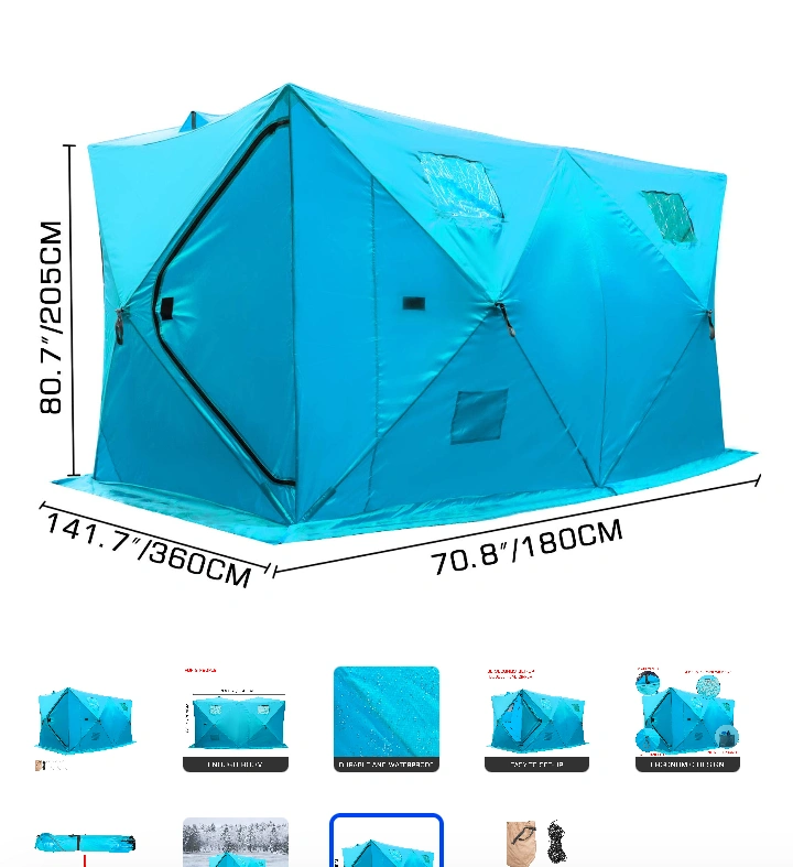 A blue pop-up ice fishing shelter. Contains detachable ventilation windows, carry bag, and 8-person capacity. Can be used as a patio tent or for the kiddos during summertime play in the yard.
