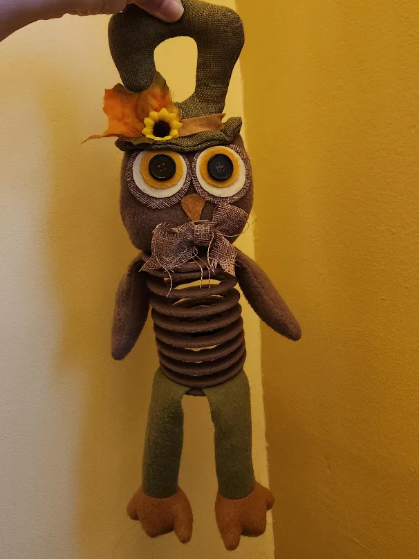 The adorable owl decoration features a hat and a sunflower. The owl's body has accordion-like design. Place it on a shelf, or use i'ts hat opening to place it on home door knob.