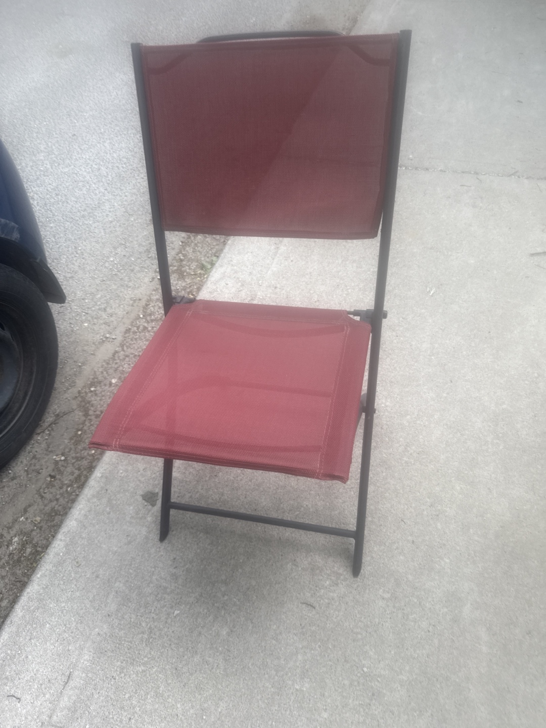 A burgundy folding chair with a dark metal frame. Back and seat made of a mesh material. This chair is perfect for your next outdoor adventure.