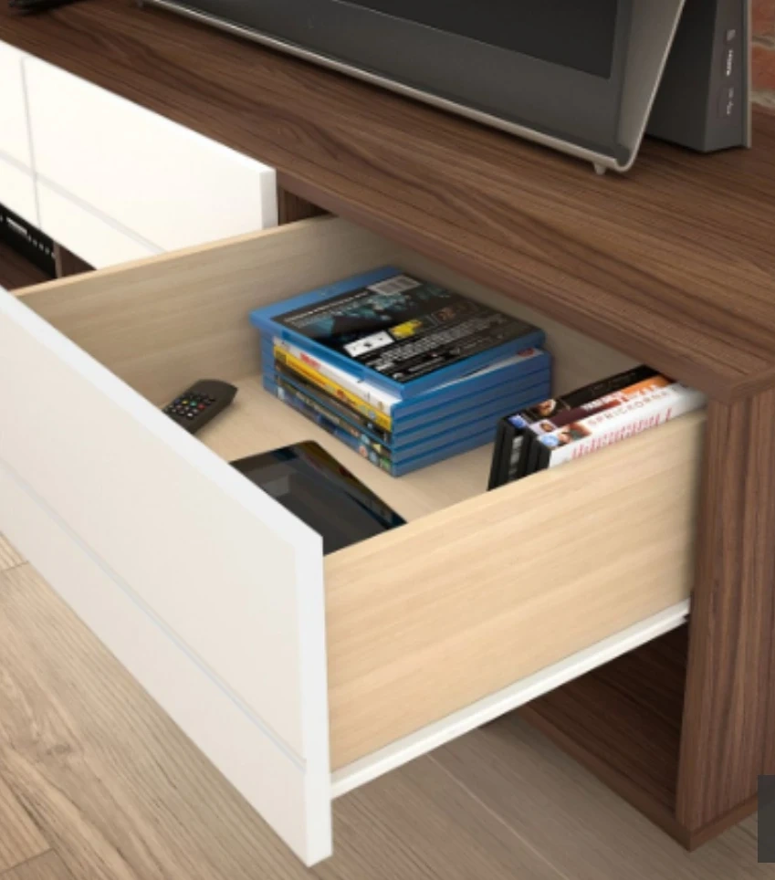 Walnut laminate finish and matte white lacquer finish.