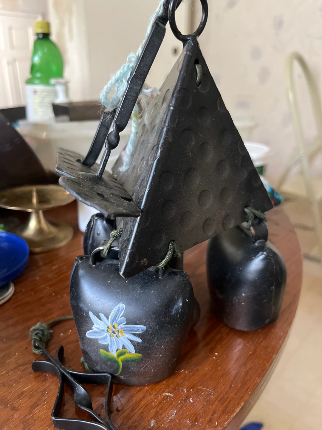 These vintage cow bells will bring a lovely sense of peace to your home. Metal cow bells, decorated with painted floral designs. They hang together with a decorative metal fixture. The cow bells are black.