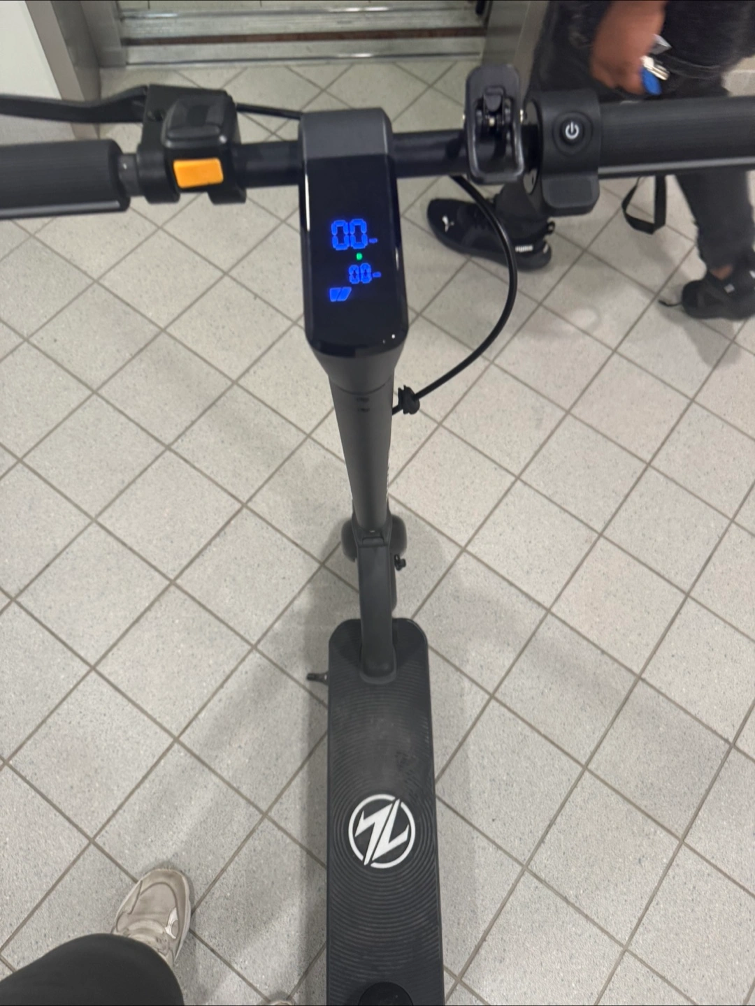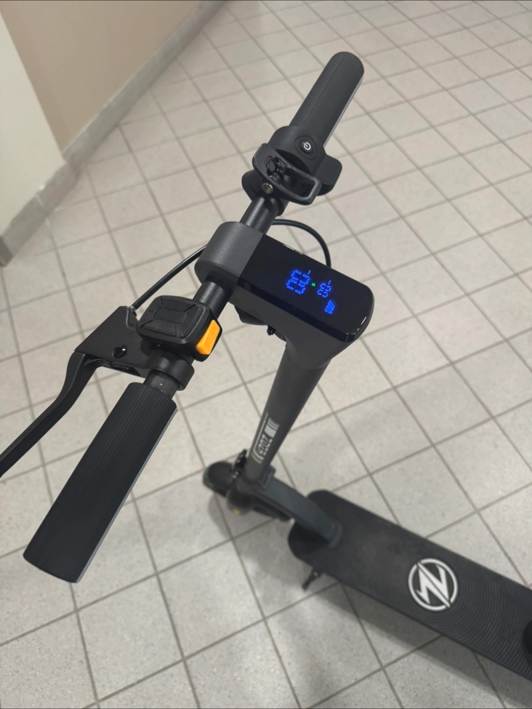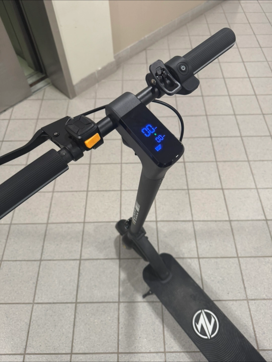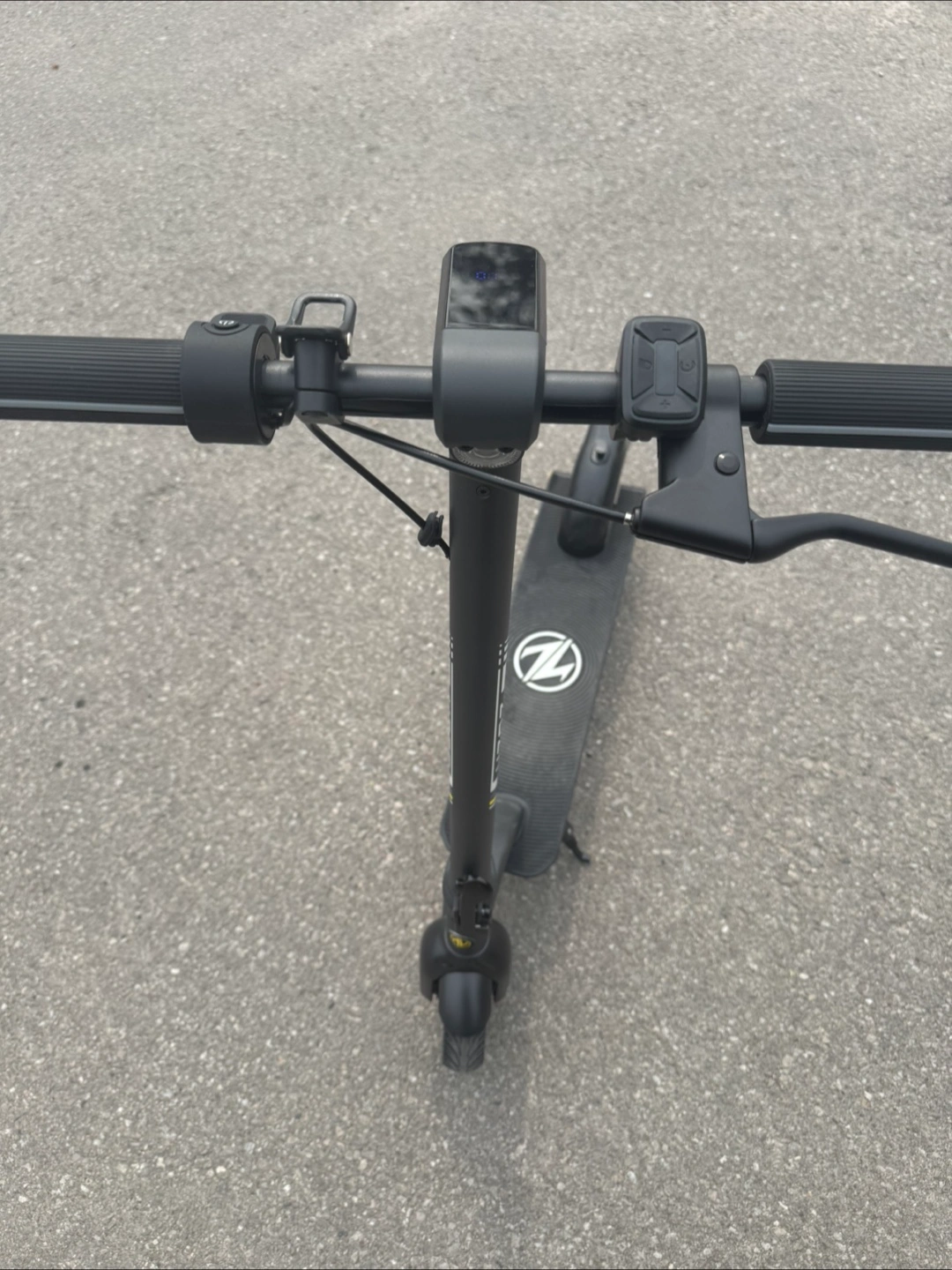 Black electric scooter. Features a digital display and digital lock🔒