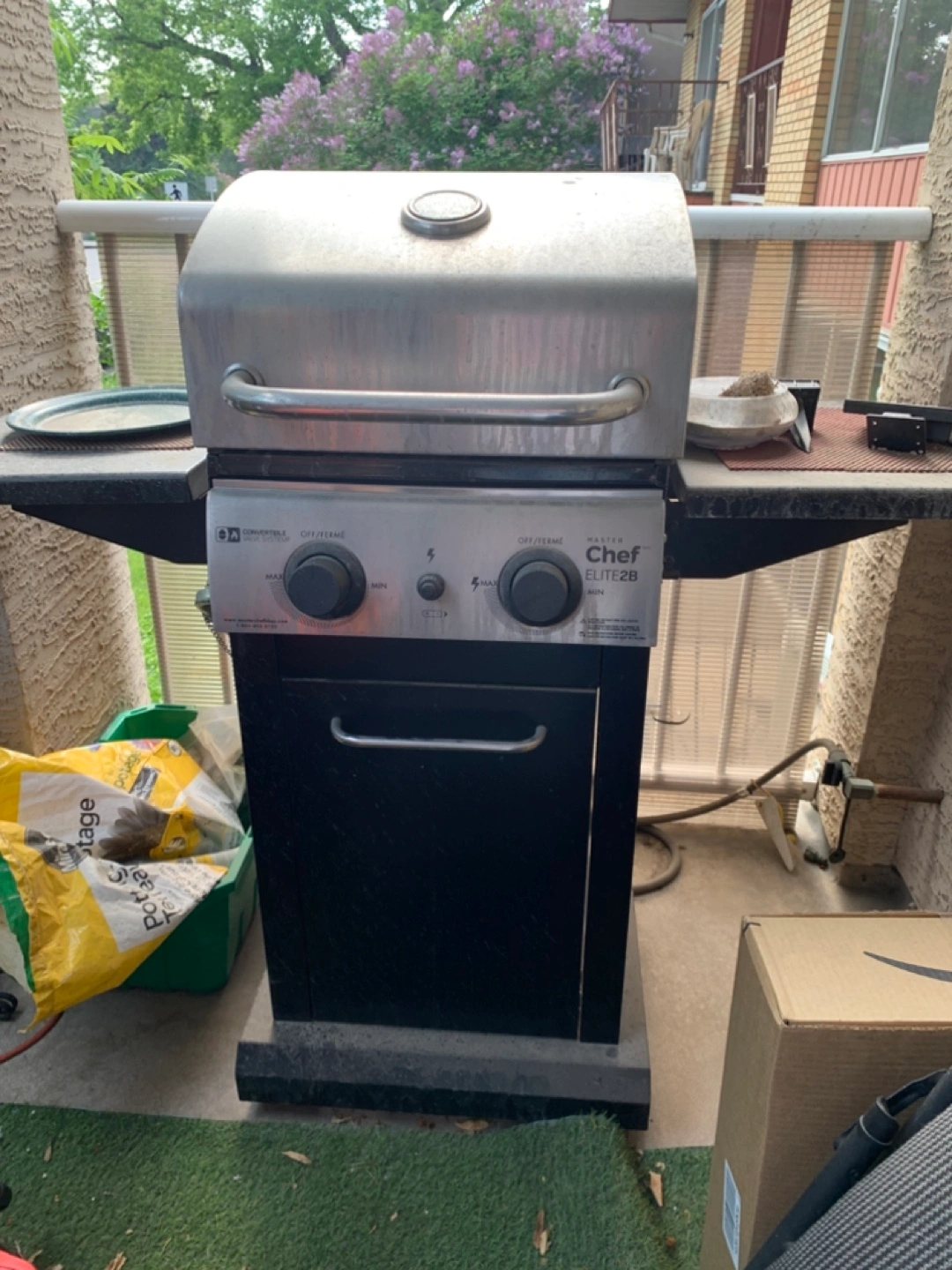 2 swivel metal frame patio chairs and gas/propane bbq.