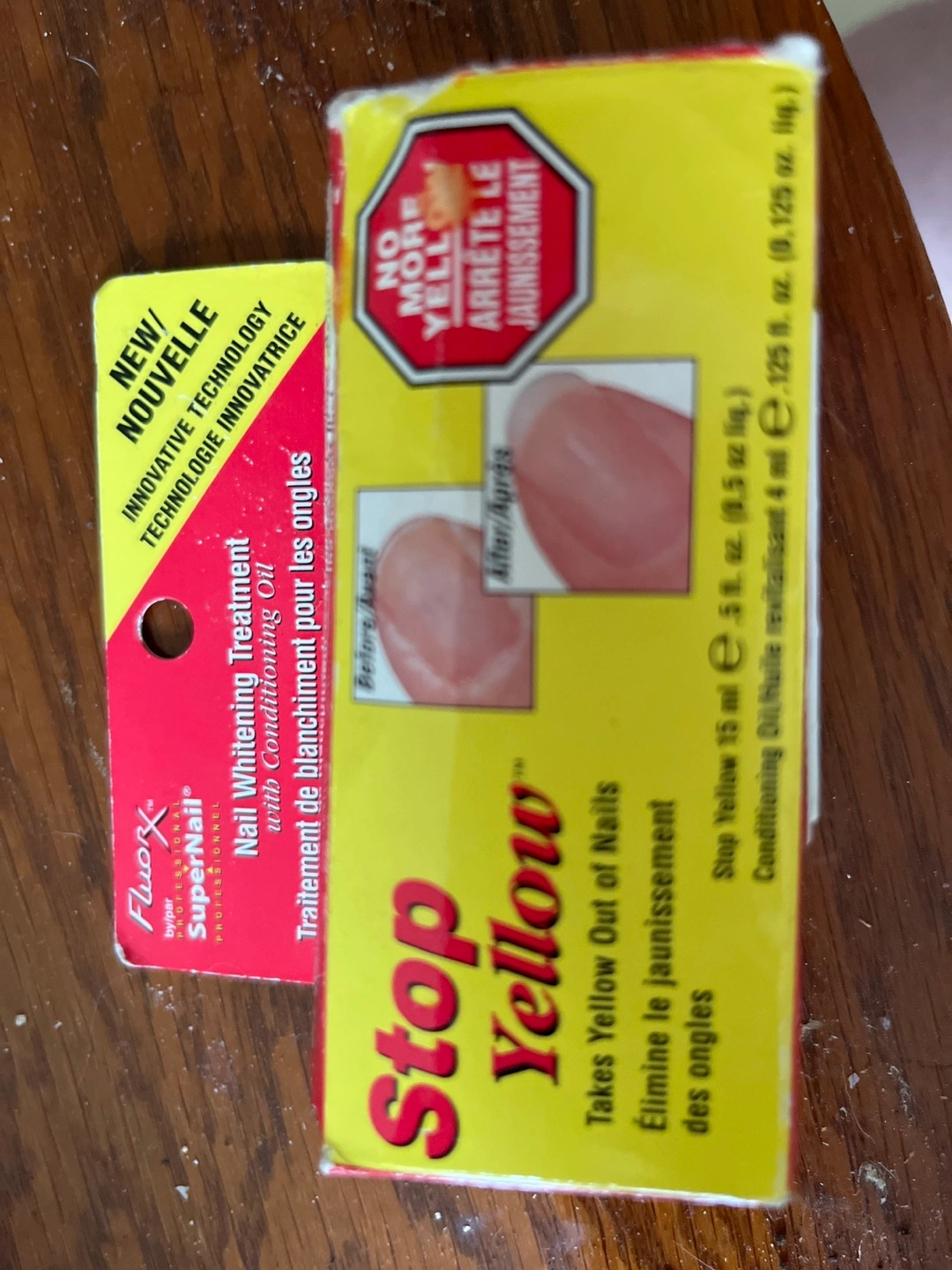 A new nail whitening treatment and conditioning oil. The packaging is yellow and red. The box displays before and after nail images. Take some time for yourself by giving your nails some extra care.