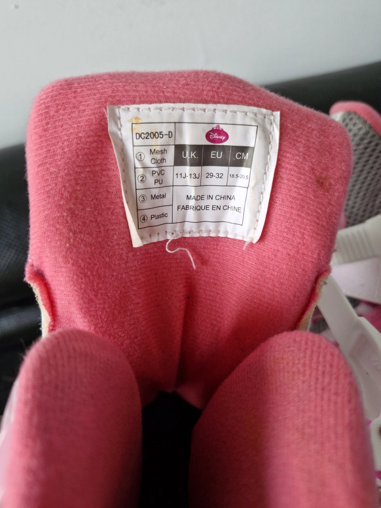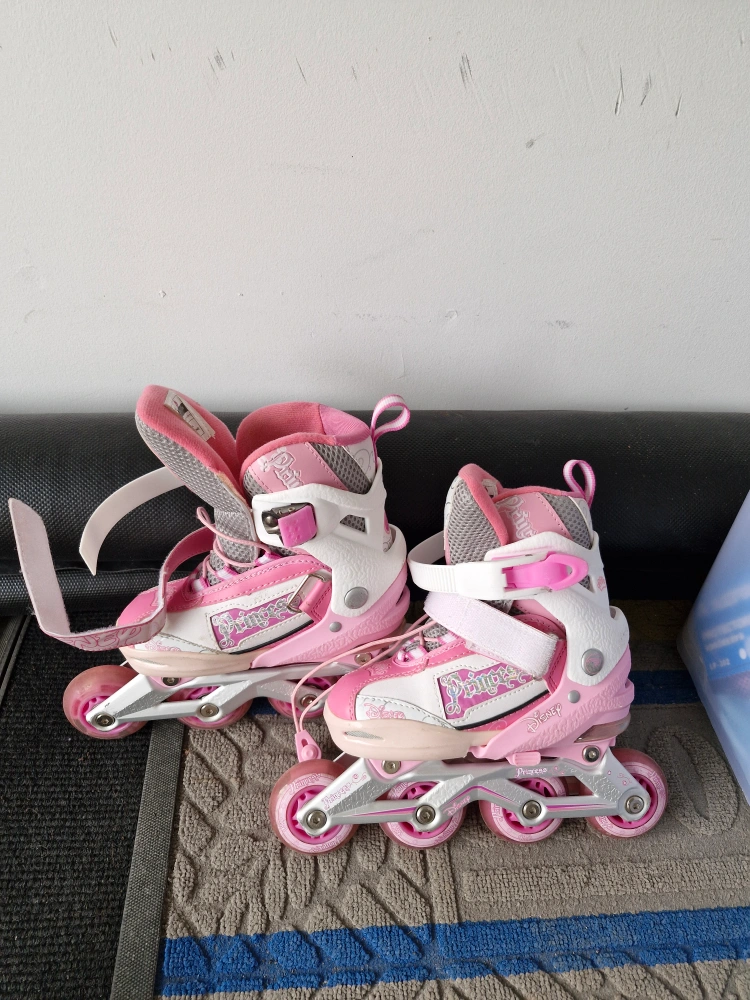 Pink and white roller skates, with a design featuring the Disney Princesses. Includes buckles and laces to adjust the fit. Great for outdoor fun on a sunny day.