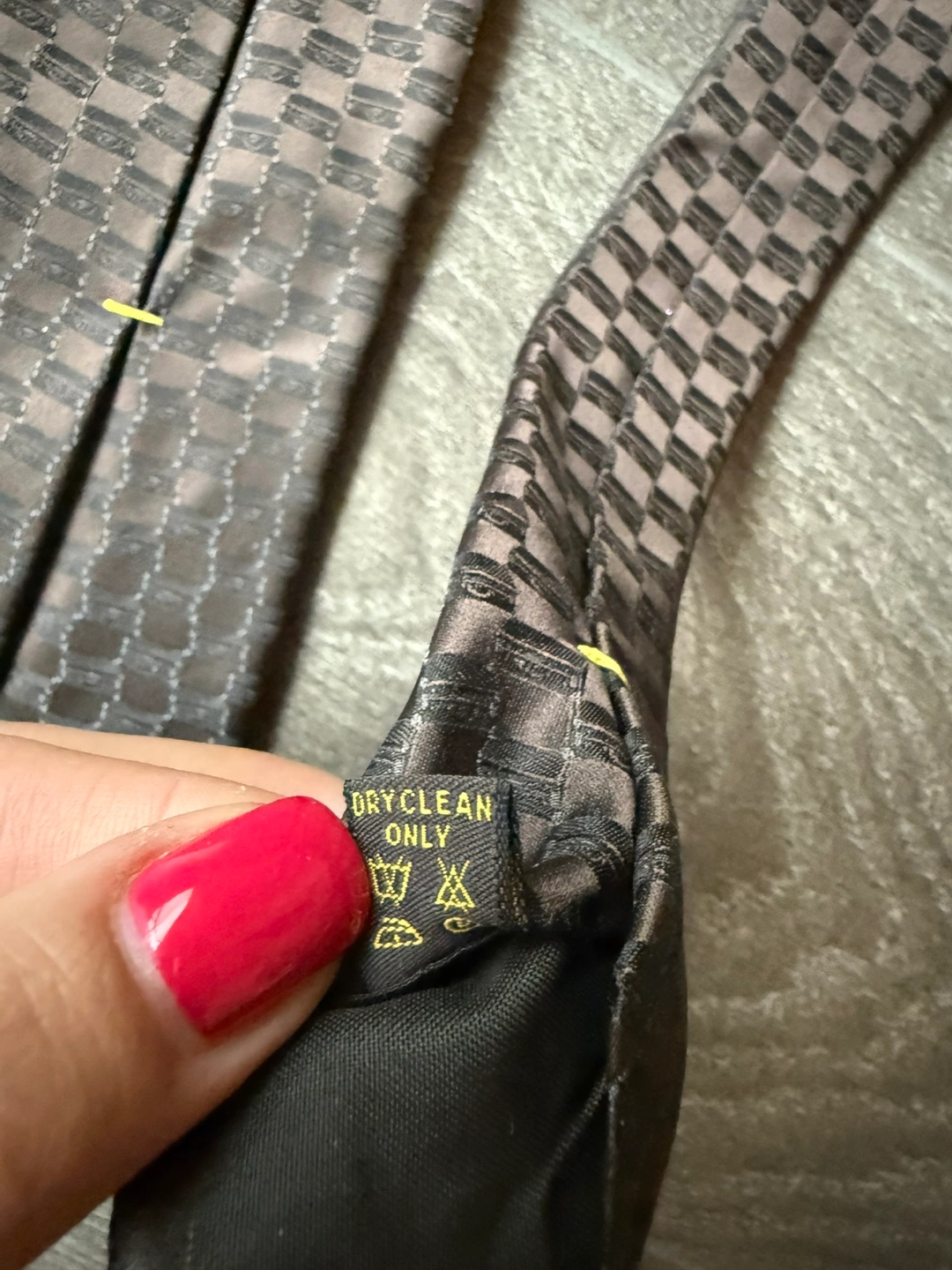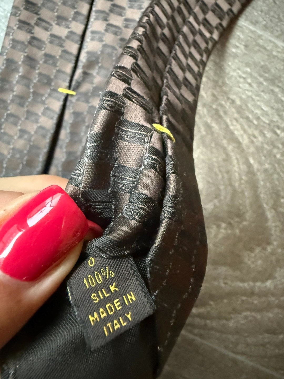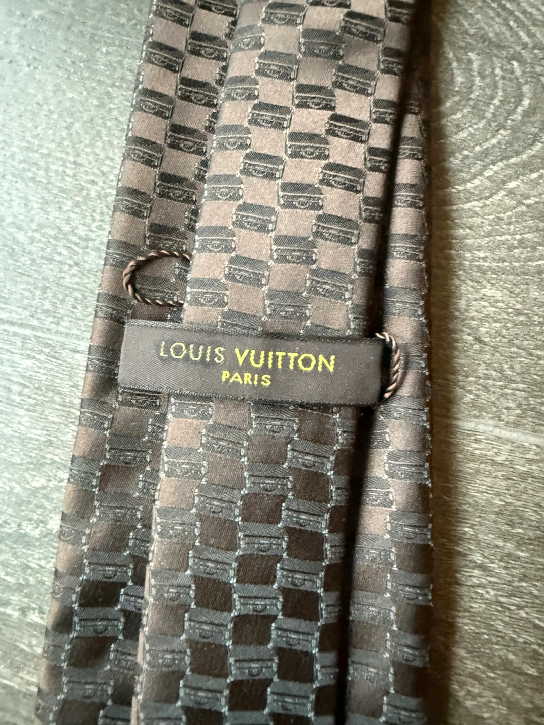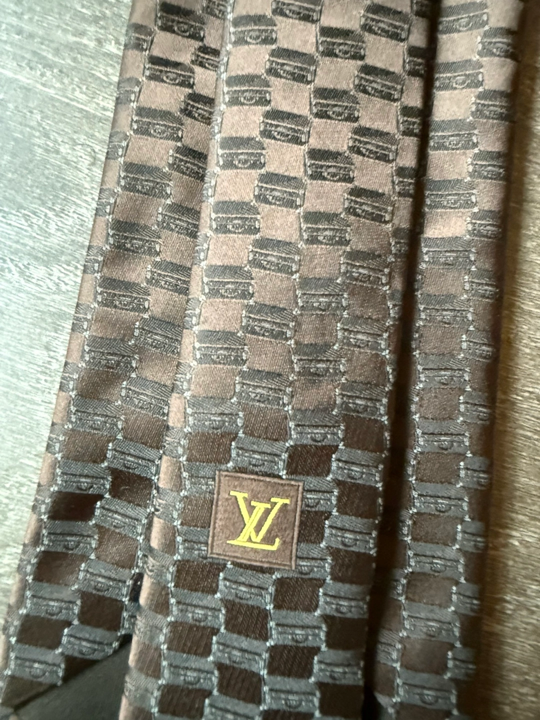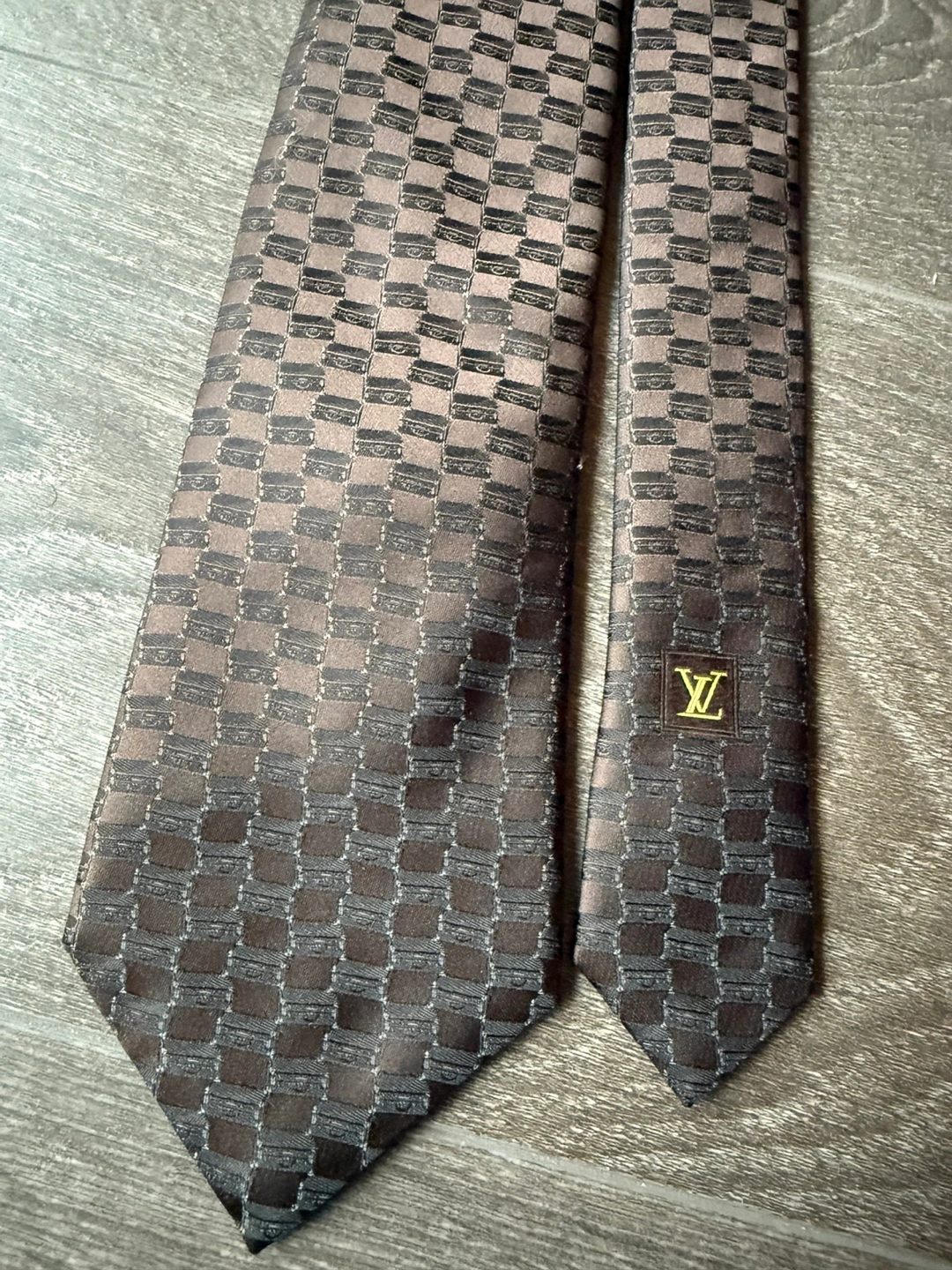 Authentic LV tie silk. A checkered tie in shades of brown. A classic tie shape. Great for a formal outing.