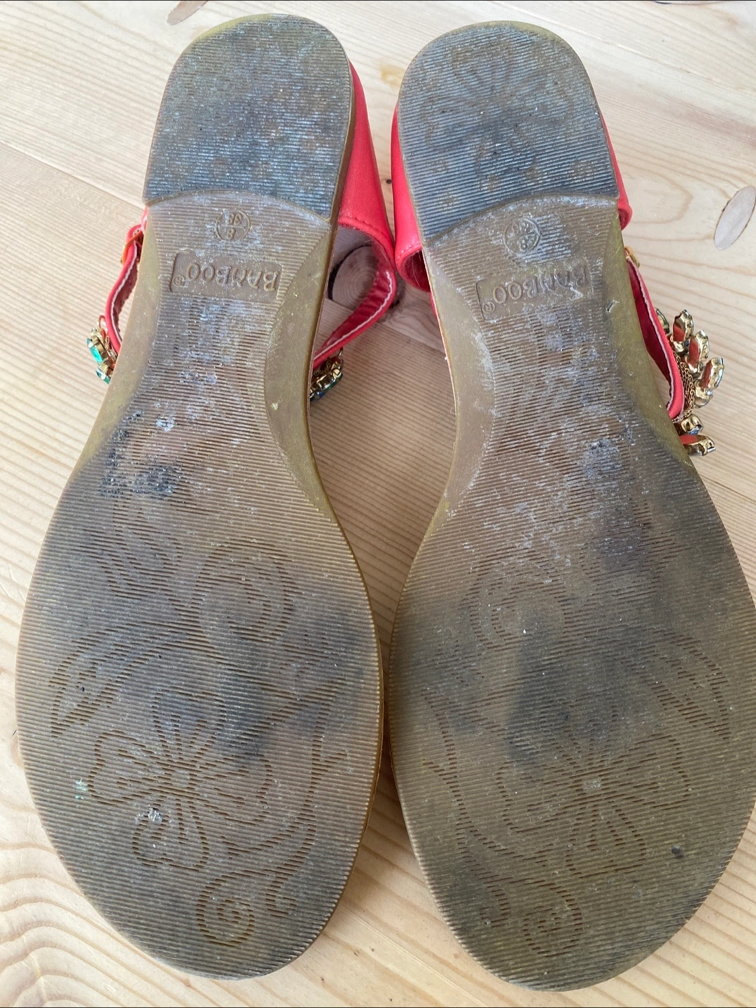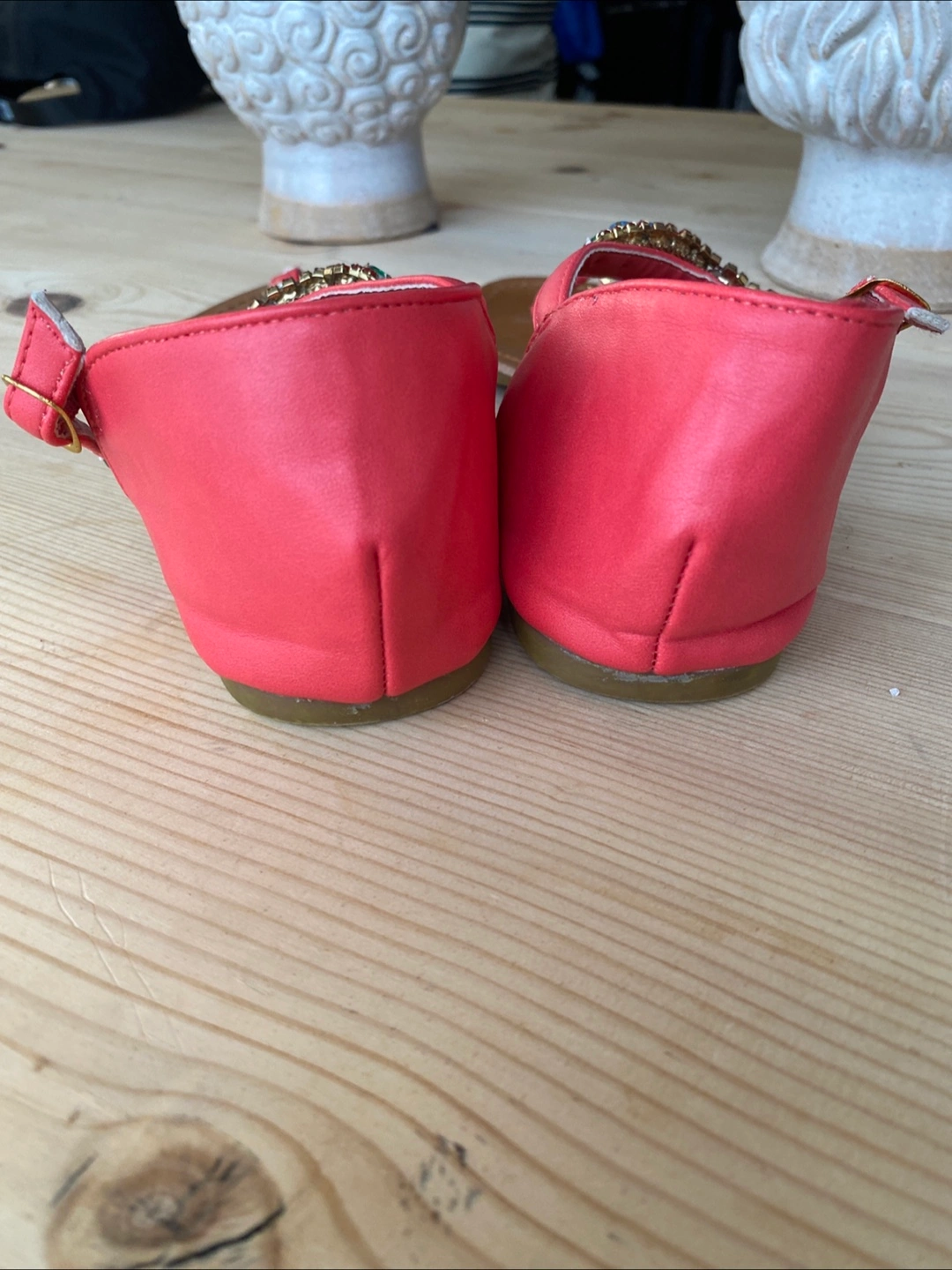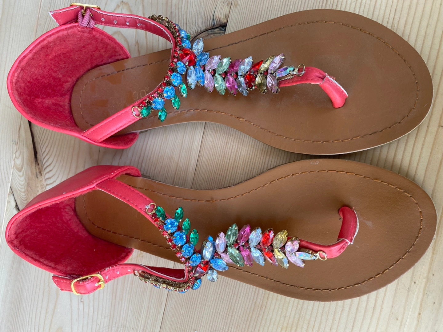 Beautiful pair of sandals, featuring colourful embellishments on the straps. Open toe design, with a strap around the ankle.