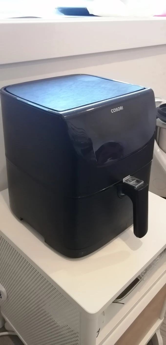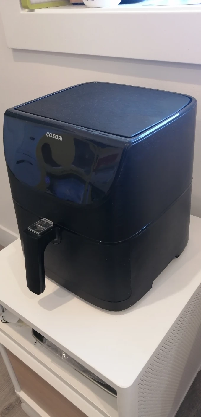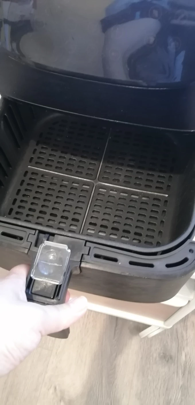 6 Qt An air fryer unit, mostly black in colour. The basket with a black grate. Features a clear handle. This is perfect for anyone looking to prepare a quick and healthy meal, feeling relaxed and at ease.