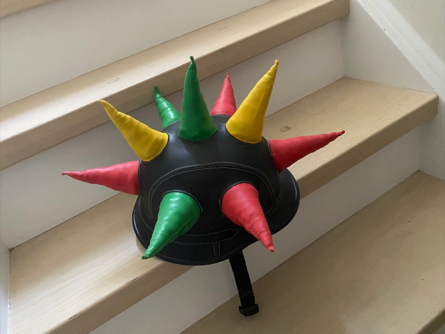 Made of dark leather. Features multiple coloured, conical spikes. Includes a chin strap. Perhaps you could use this item to add a little more flair to your daily life.