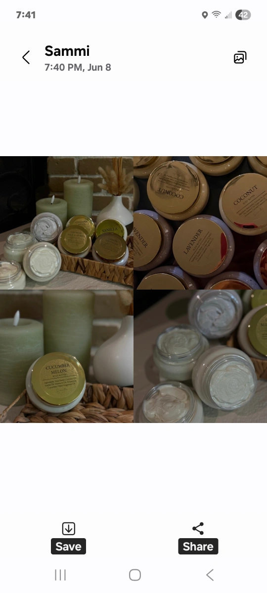 Assortment of body butters with various scents. Scents include lavender, coconut, cucumber melon, and vanilla. Great to use after a relaxing shower.