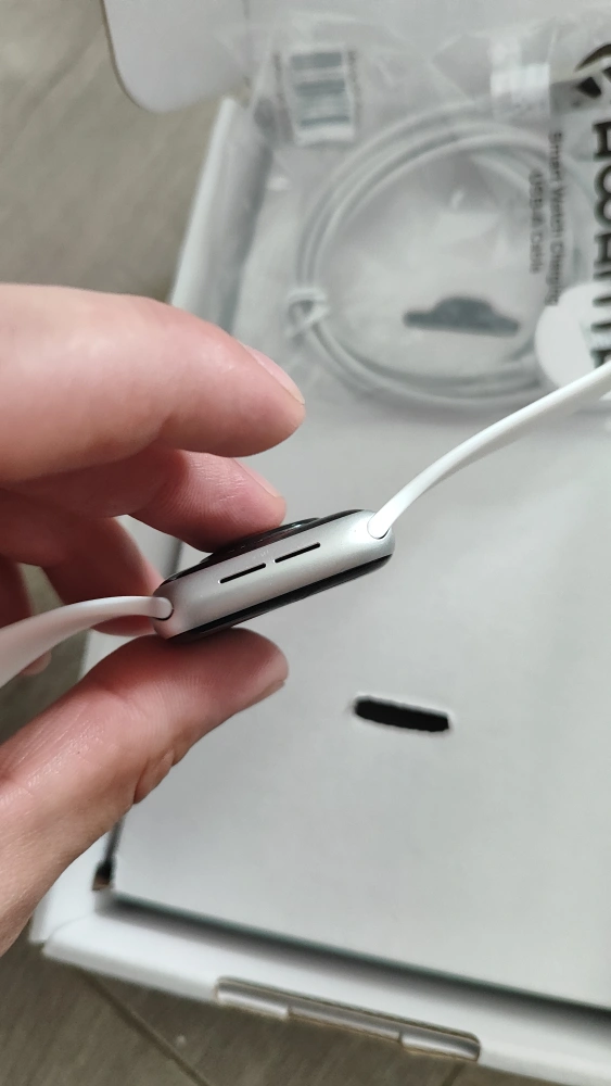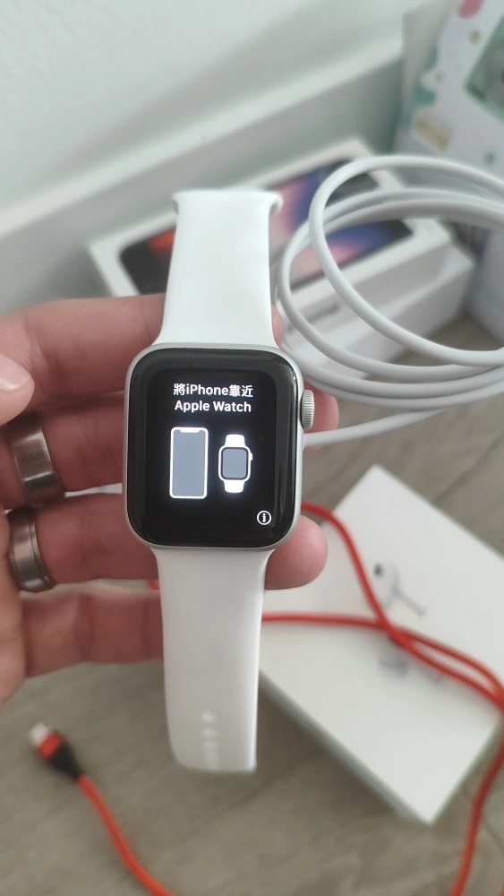 A smart watch. White sport band. Silver case. Display screen. Comes with a charger. Consider this watch to support your active lifestyle and maintain a sense of calm.