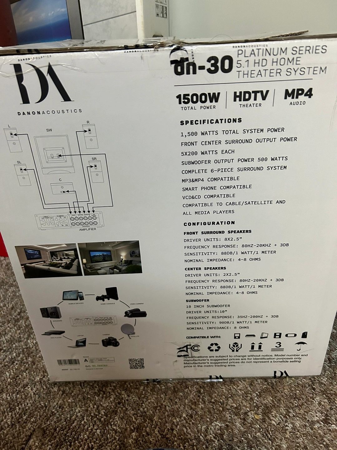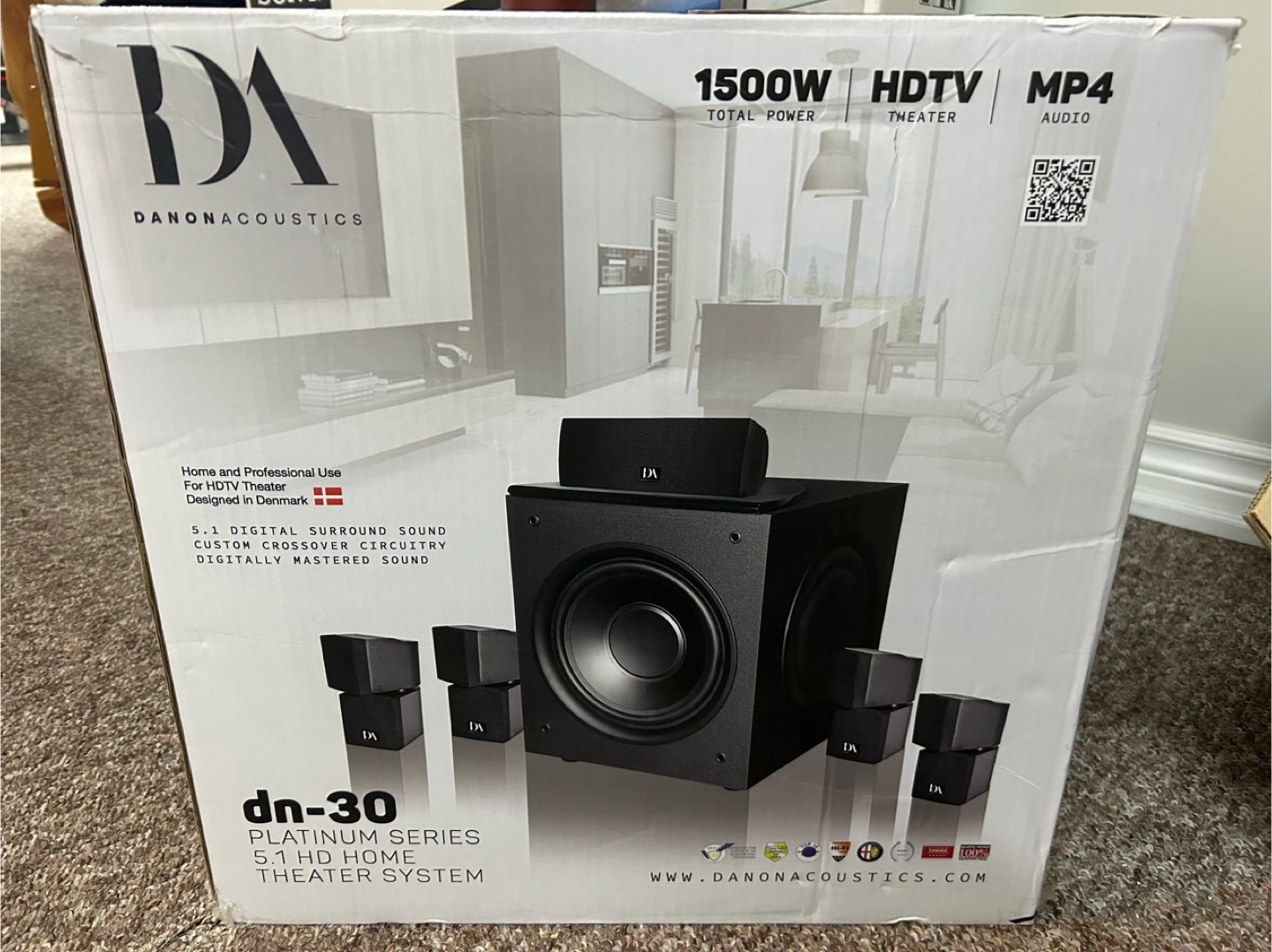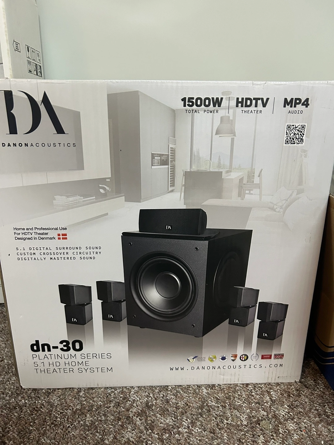 Brand New still in the box. Never used. This Danonacoustics home theater system, perfect for watching movies. A subwoofer and surround sound speakers. The box shows details about the total power, specifications, and compatible devices.
