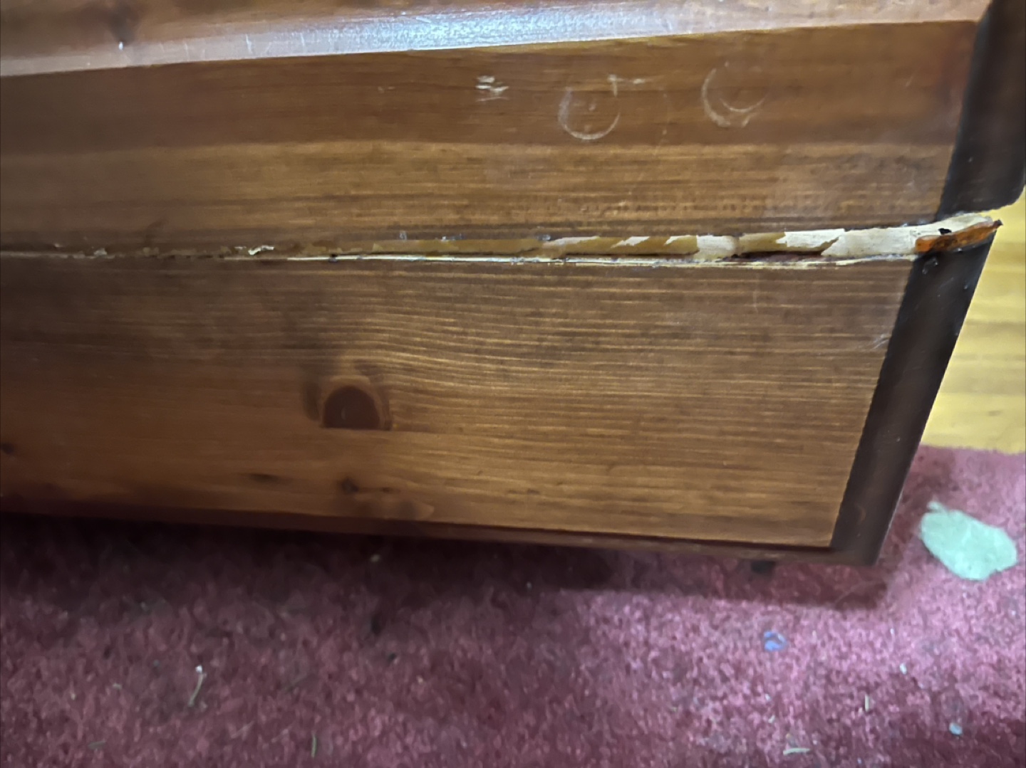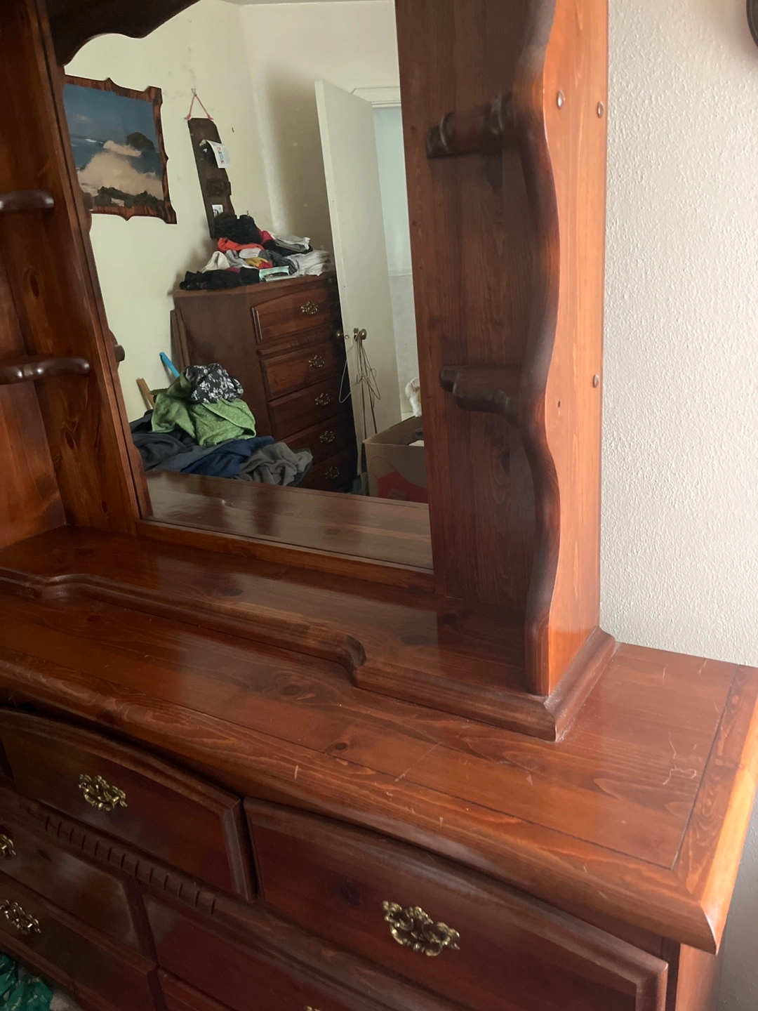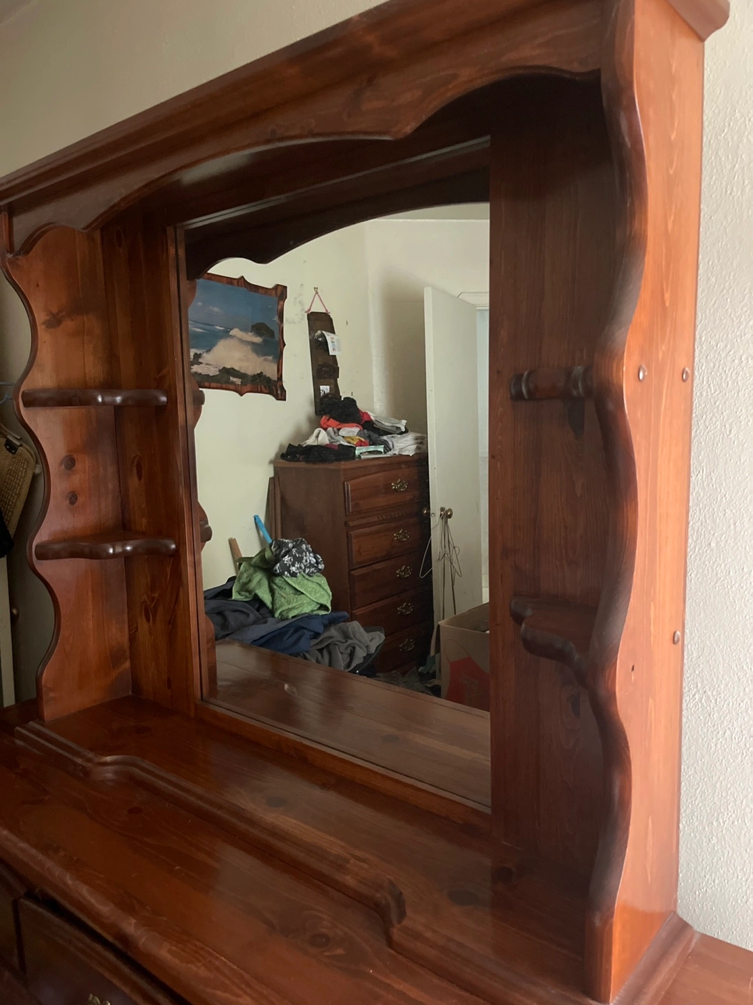 Beautiful wooden dresser with a mirror. Features a top section with a mirror and small shelves. Also has decorative side elements. This dresser would make a great addition to any bedroom as a place to organize your belongings.