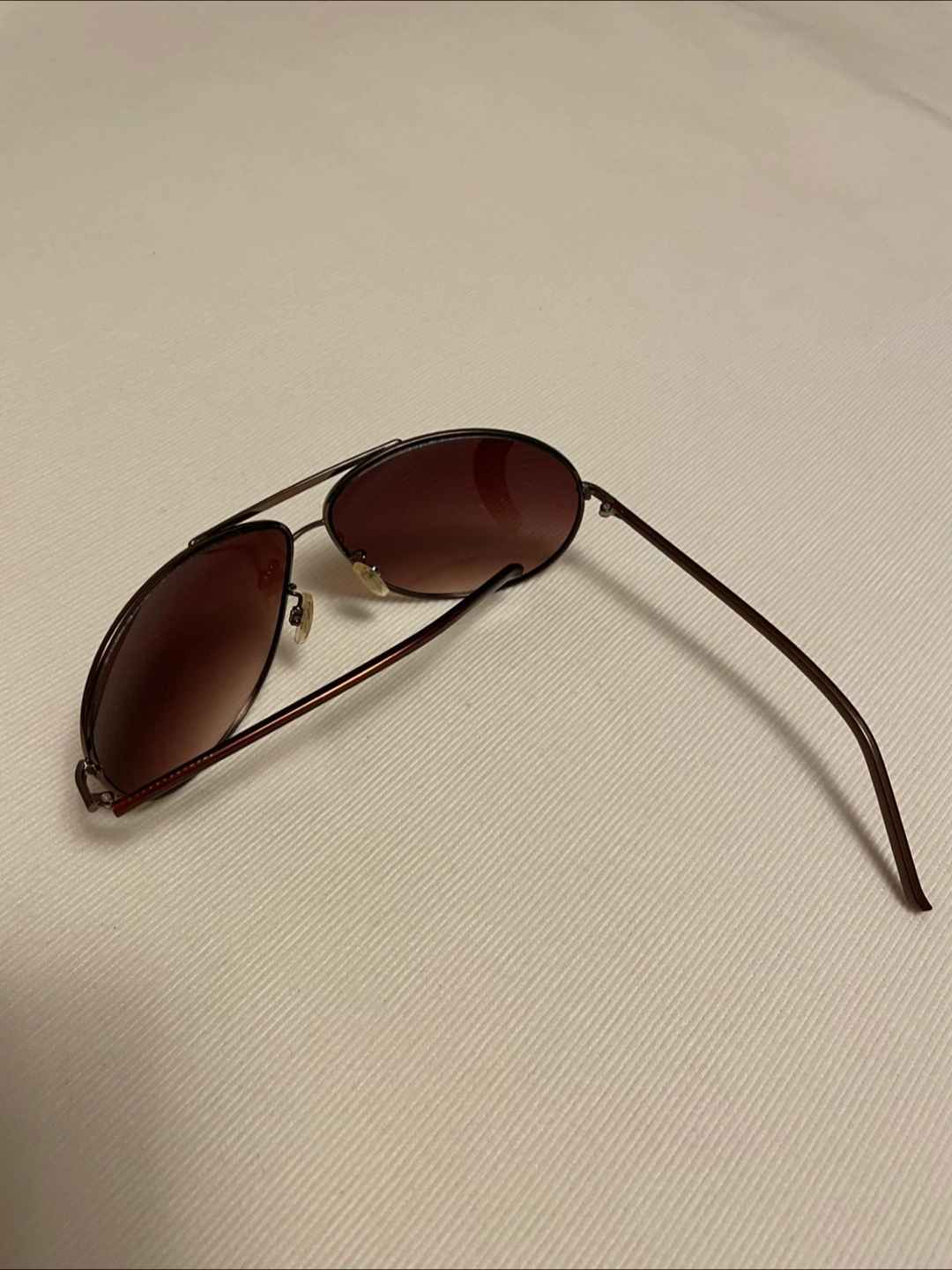 Aviator sunglasses featuring brown lenses and copper metal frames. Versatile unisex style. Perfect for summer.