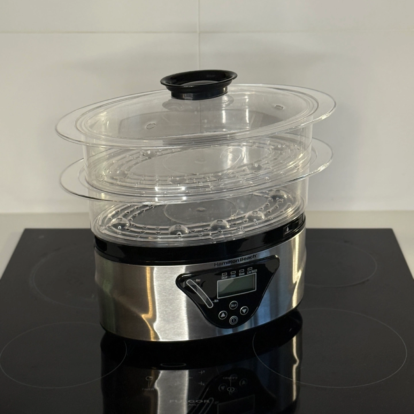 Versatile, stackable 2-tier steaming trays, nestle for easy storage