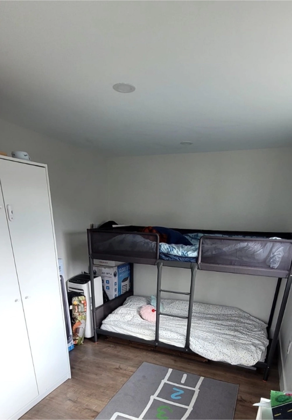 Ikea bunk bed frame, perfect for maximizing space in a bedroom. Features a ladder for easy access to the top bunk.