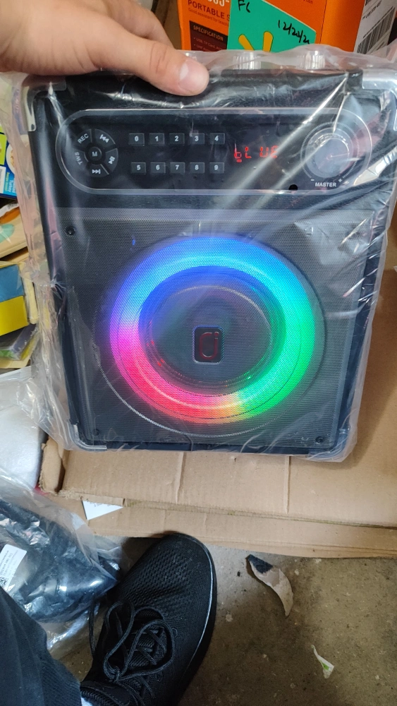Speaker with built-in lights. Comes with microphones, a remote, and charging cables. Could be ideal for a quiet evening of karaoke.