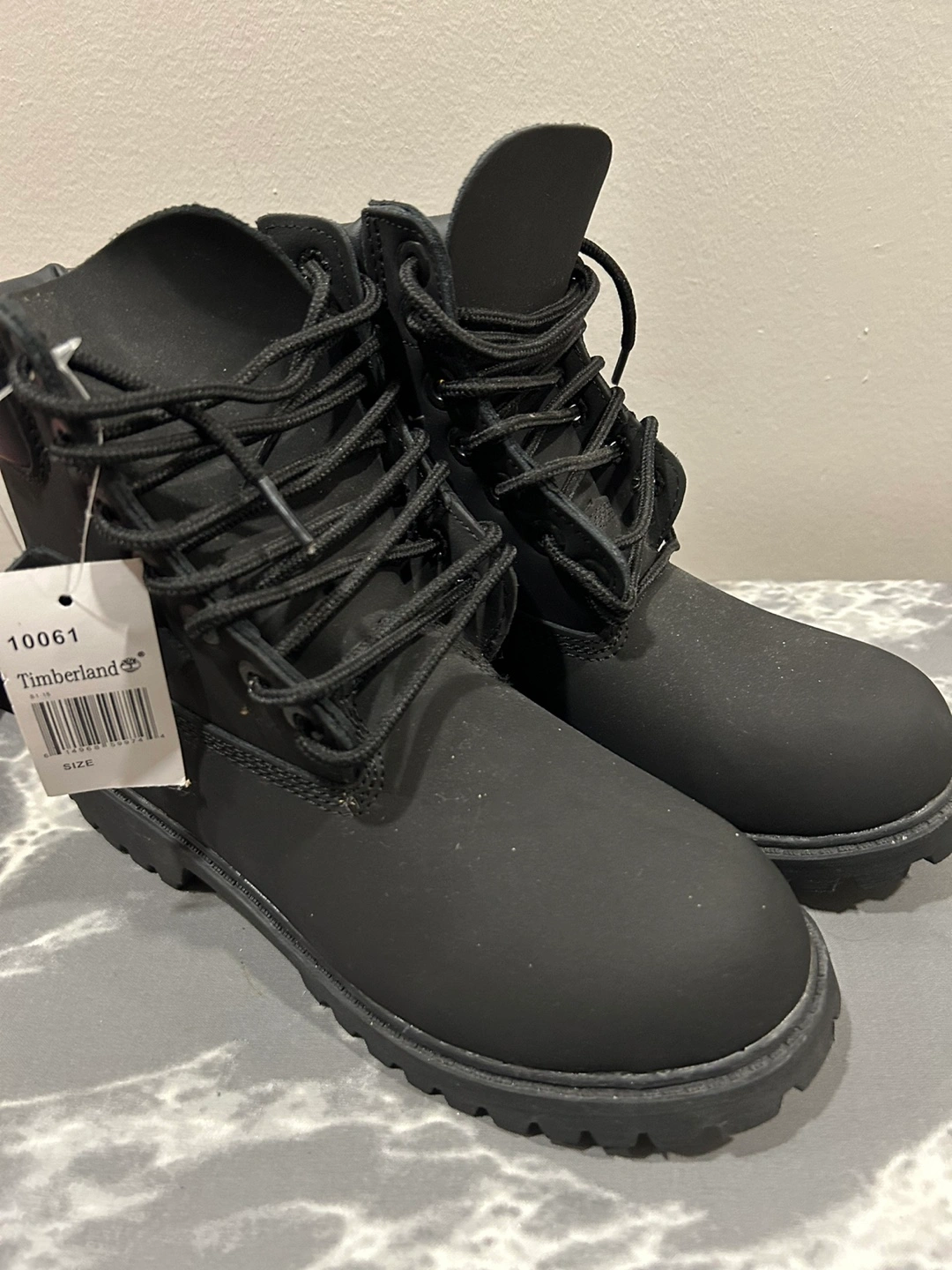 These black boots feature a classic lace-up design. The boots have a padded collar and the Timberland logo embossed on the side. A perfect choice for anyone needing comfortable footwear.