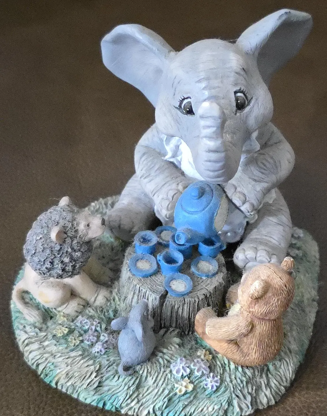 Figurine of an elephant with a teapot and teacups. Other animal friends surround the elephant, sitting in a grassy area. Consider placing it on your shelf for a cozy touch.