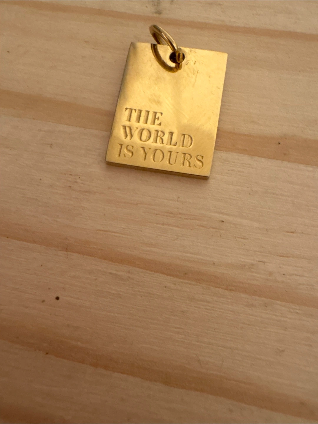 The gold-toned pendant presents a rectangular shape. The text is engraved in a sans-serif font on the front. It features a loop at the top. You can let this pendant remind you of opportunities while going about your day.